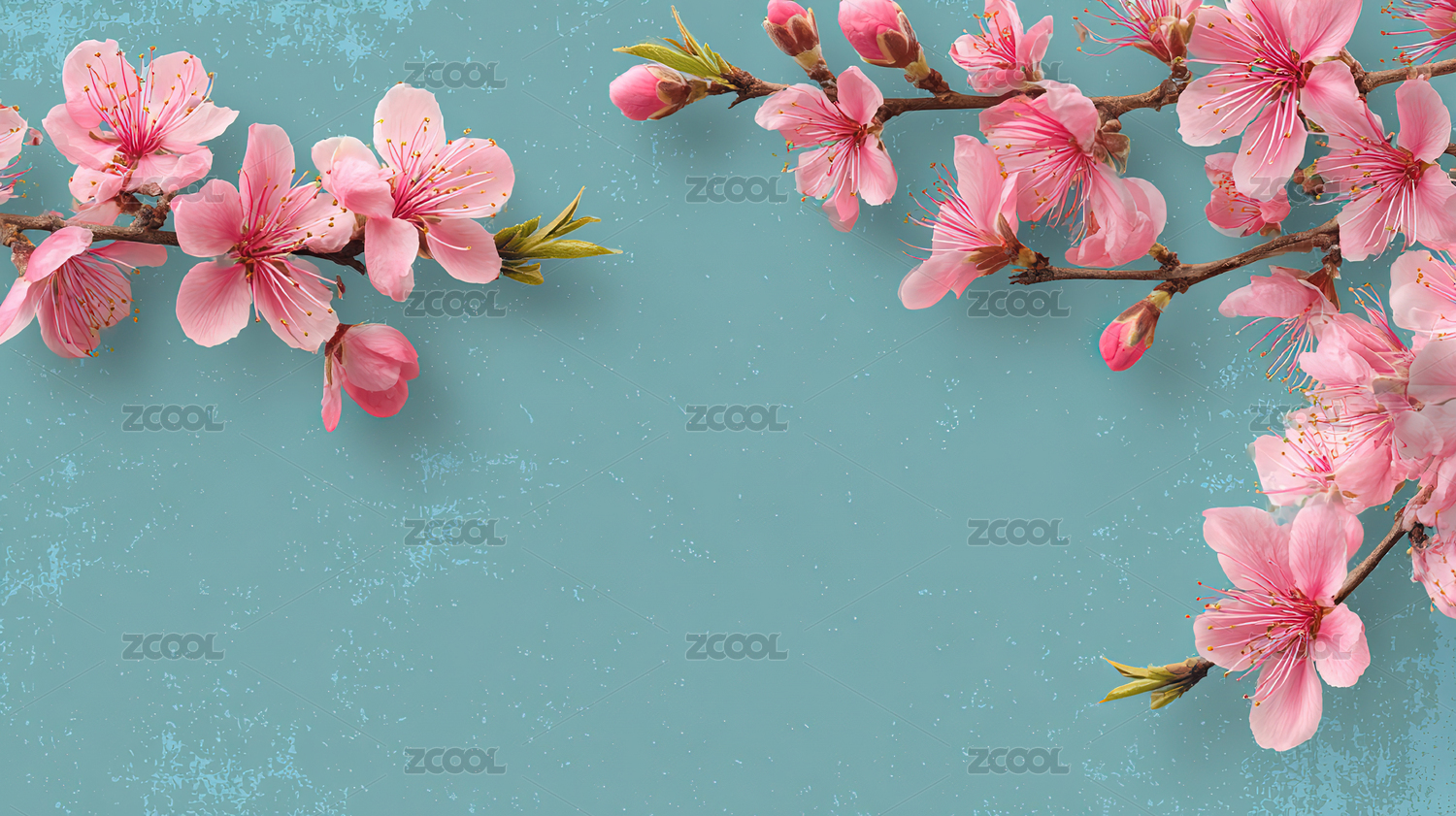 蓝色背景下的粉色樱花枝