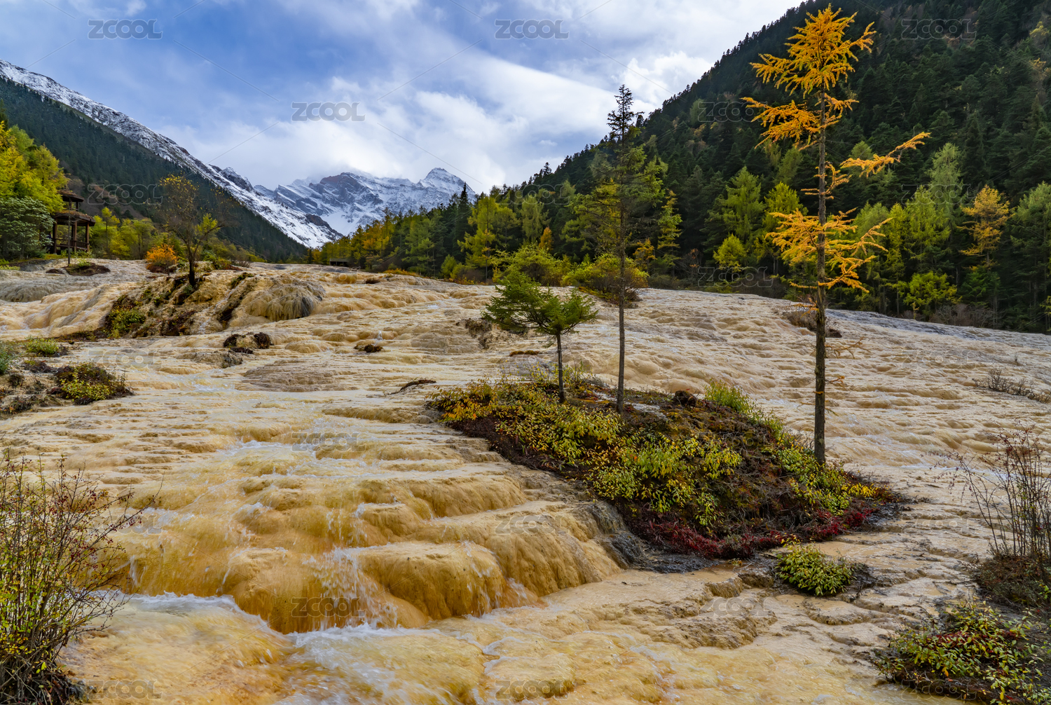四川松潘县黄龙景区雪山下金黄色钙华沟滩