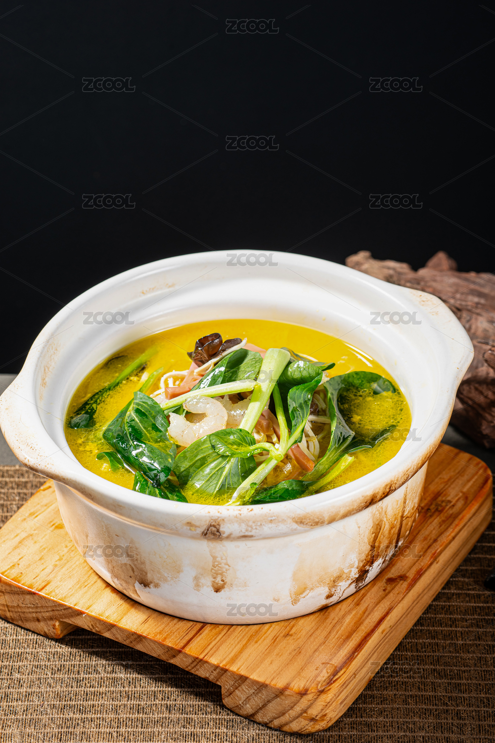 浓汤虾仁贝丁火腿皮蛋烩菠菜
