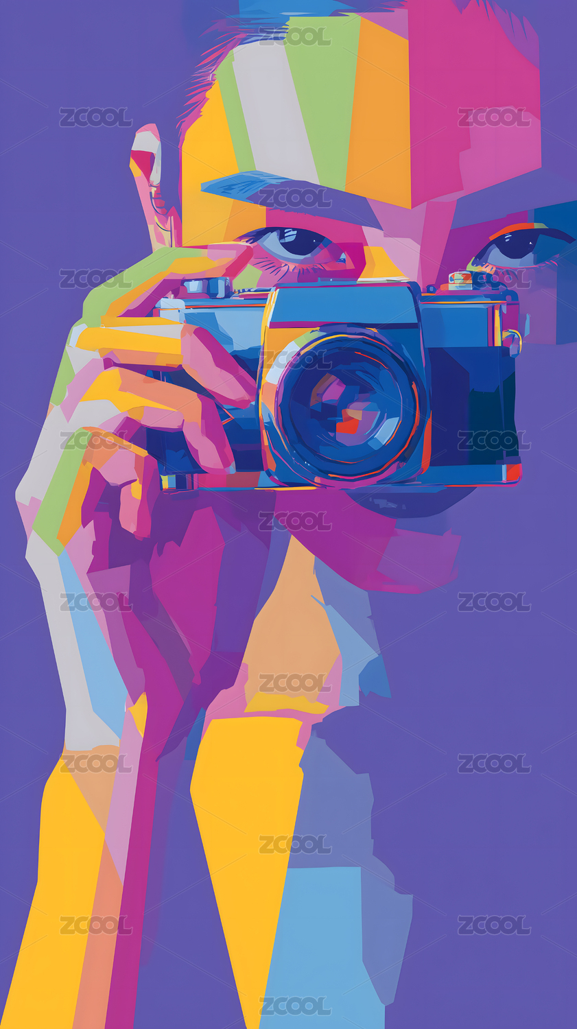 人物,插画,平面,扁平,色块,极简风,手绘,摄影师,相机,背包