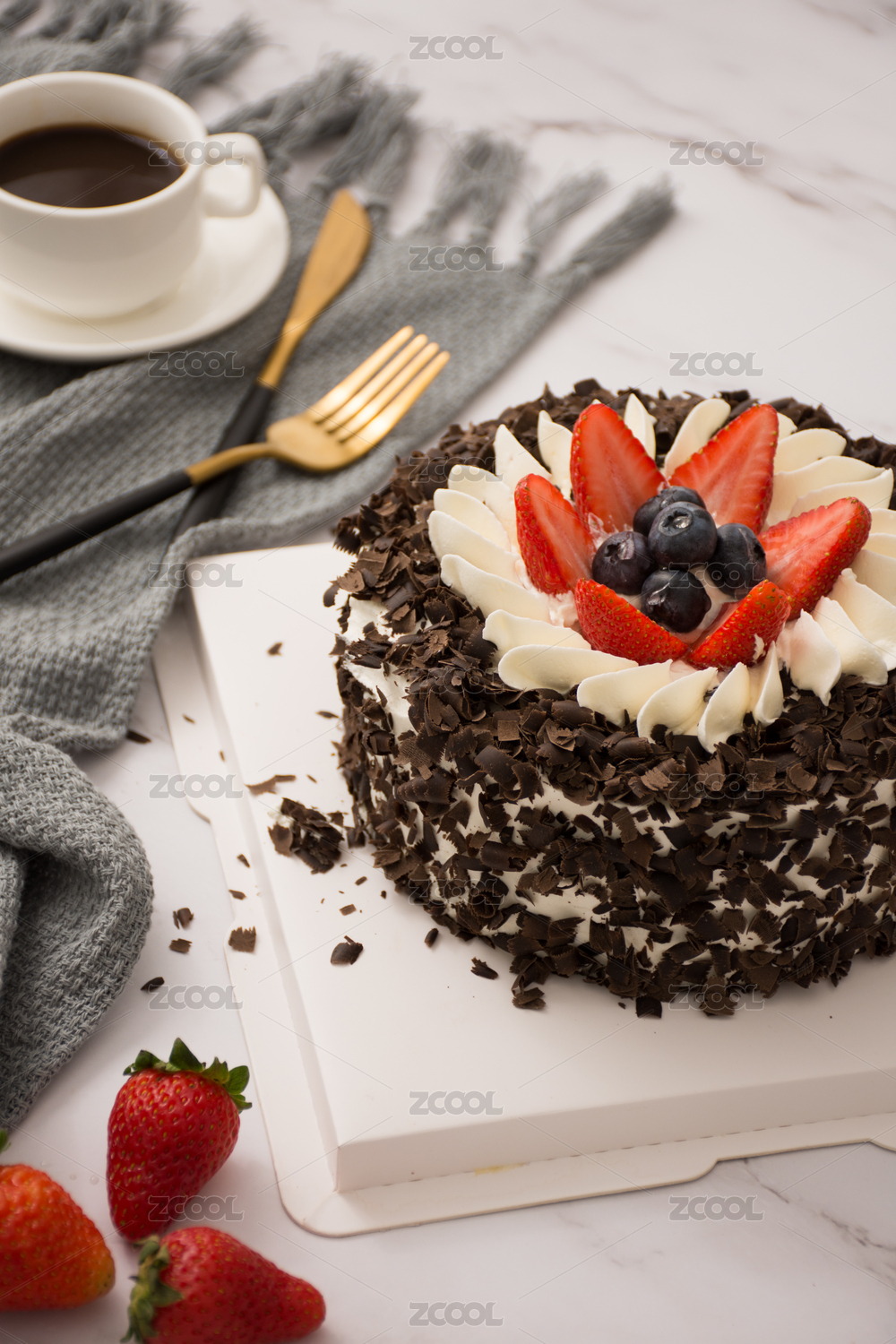 白色纱布上放着一个蛋糕