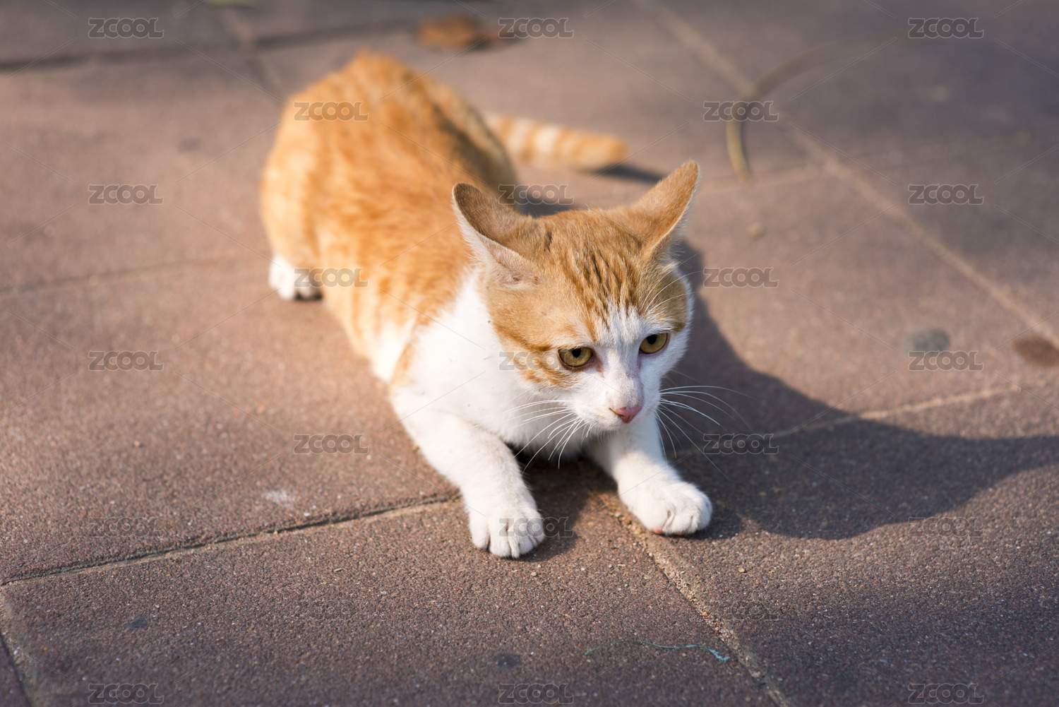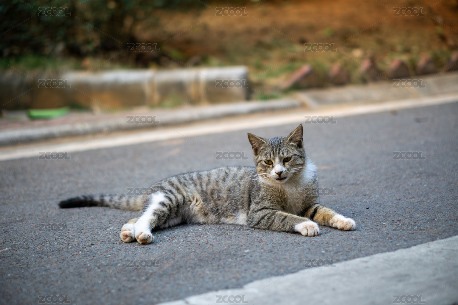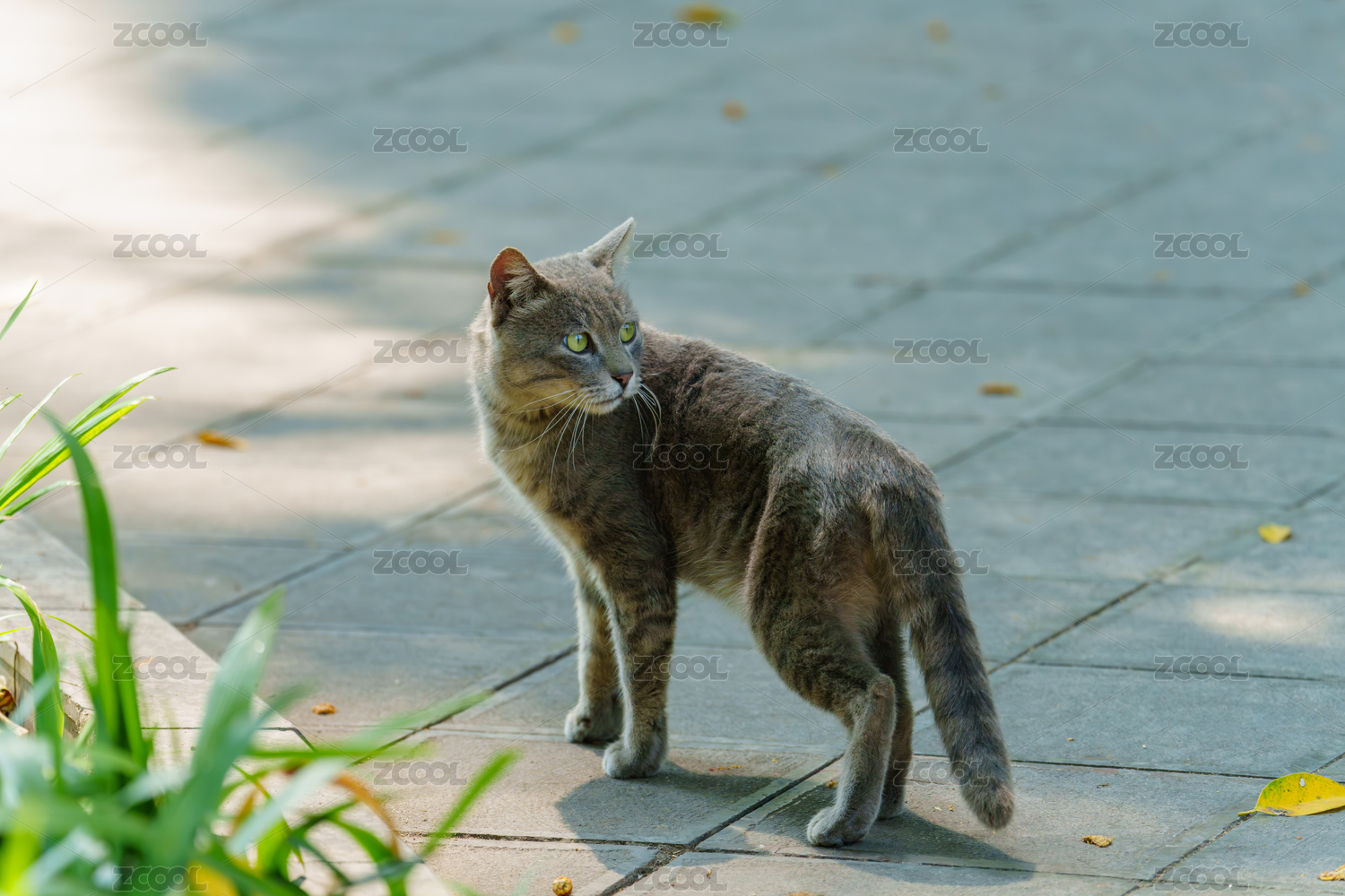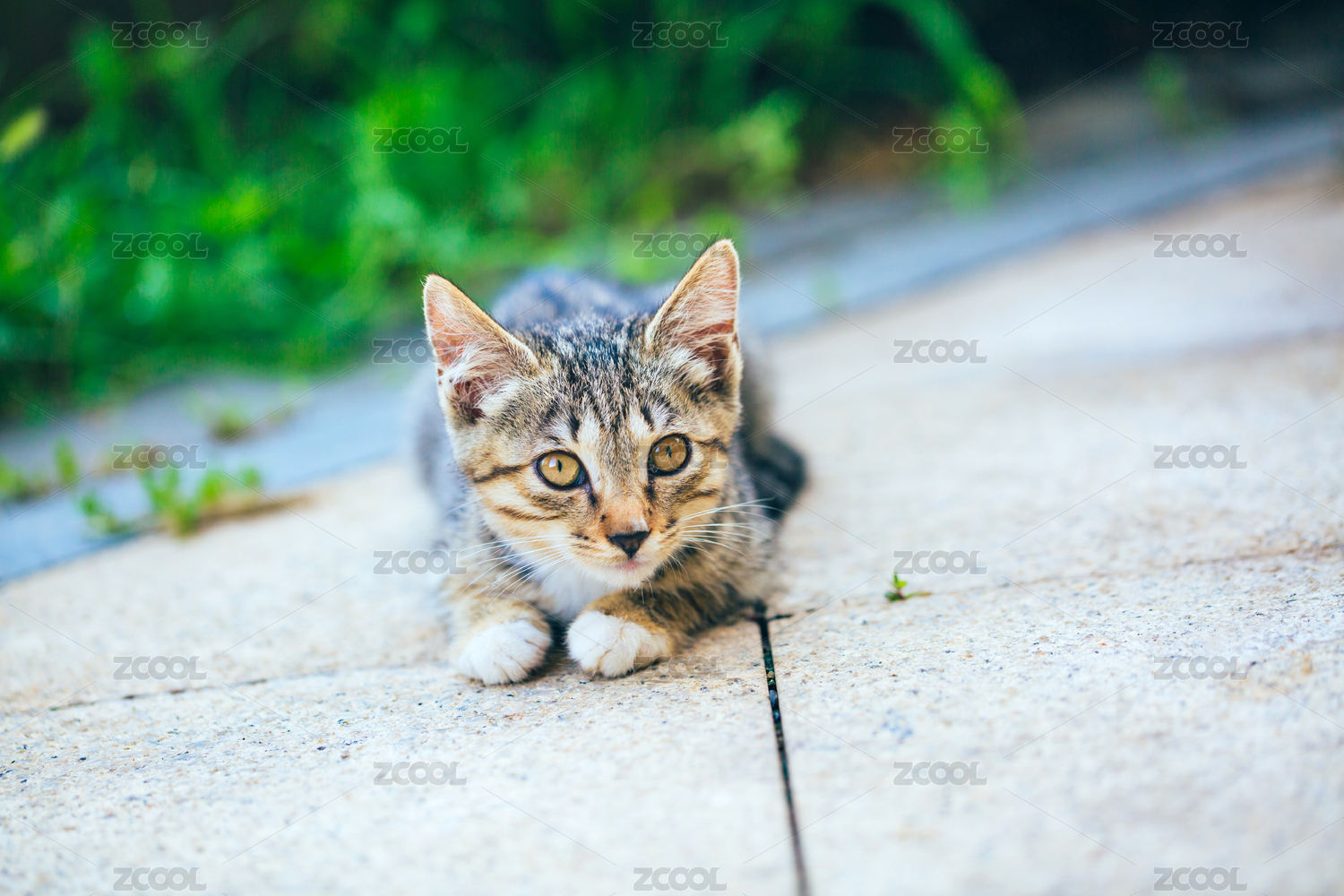 户外路面上流浪的可爱小猫特写镜头和绿色的背景