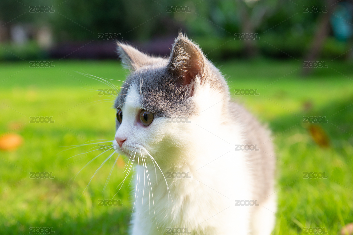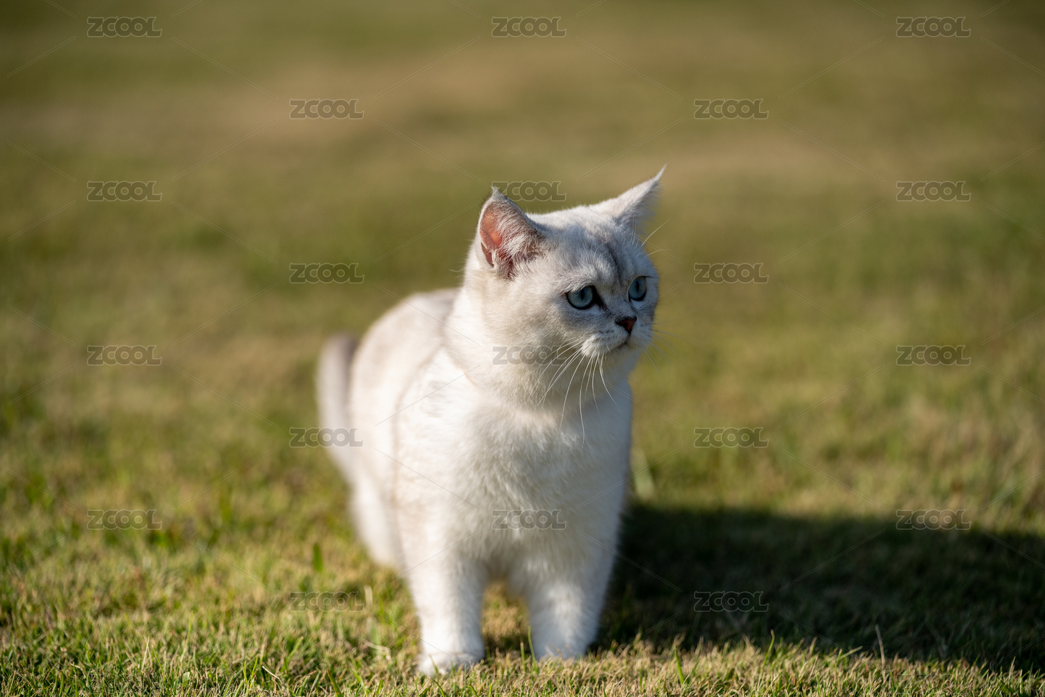 一只可爱的英短蓝白小猫咪在公园的草地上玩
