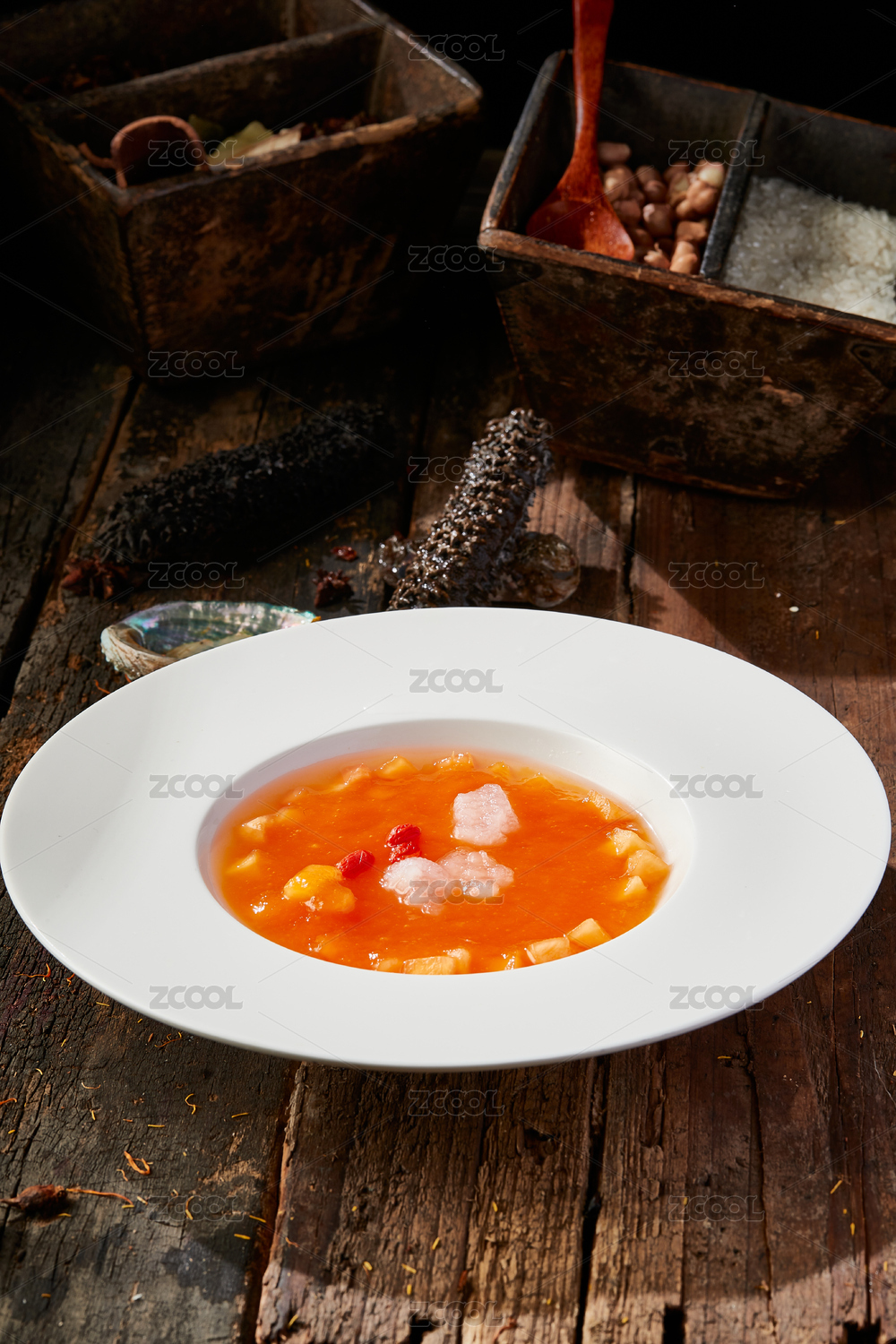 木瓜炖雪蛤,甜品,勺子,暗色调,棕色木纹桌面,冰糖粥