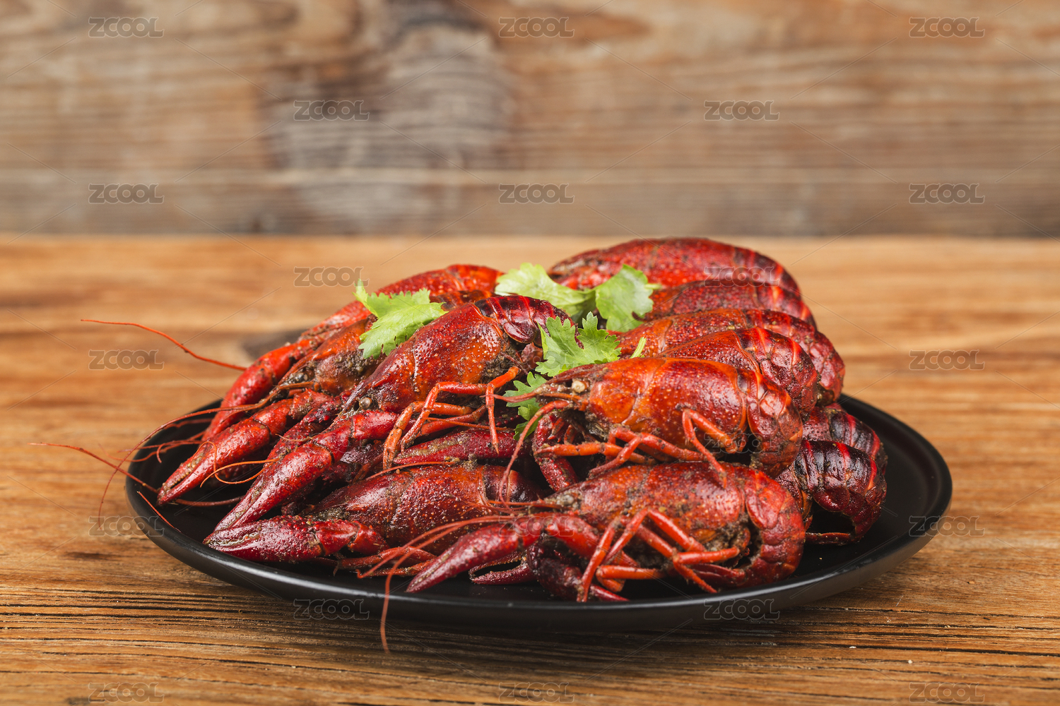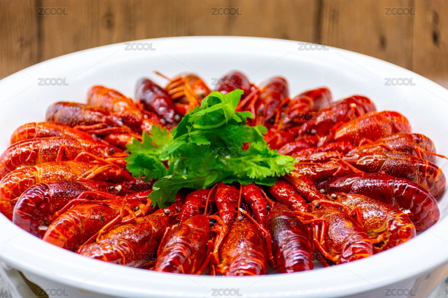整齐摆盘的麻辣小龙虾盛放在圆形的蓝边碗内