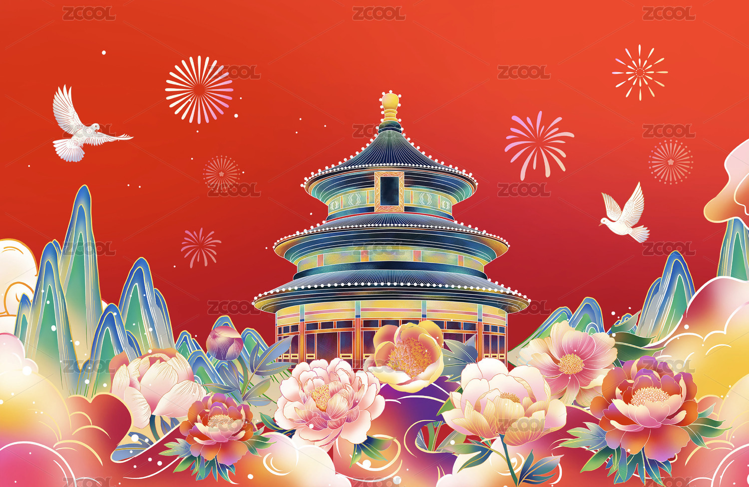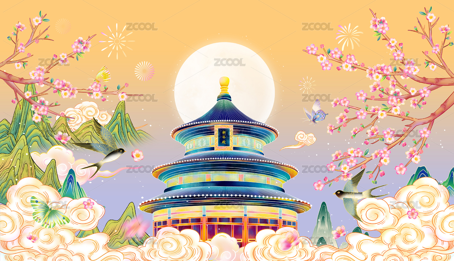 中秋节天坛祈年殿桃花盛开国潮插画海报背景