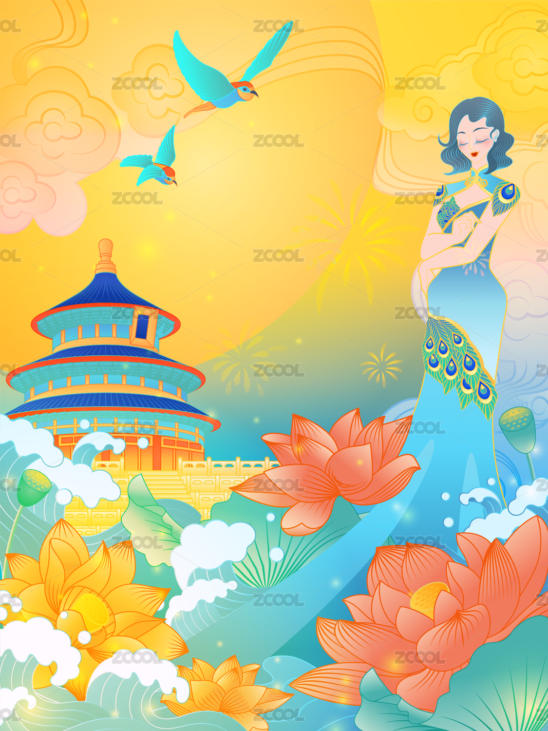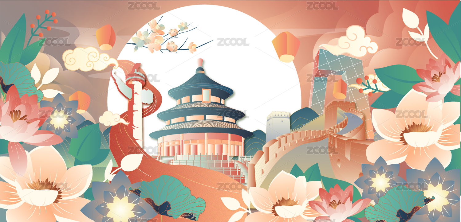 北京故宫天安门天坛祈年殿城市地标建筑插画