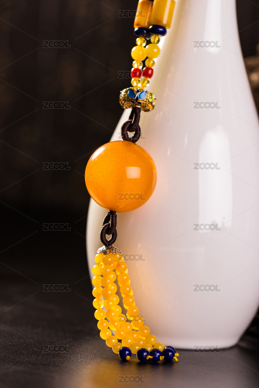 琥珀蜜蜡项链吊坠鸡油黄色中式复古佛家禅意的天然珠宝在深色背景中 文艺风格