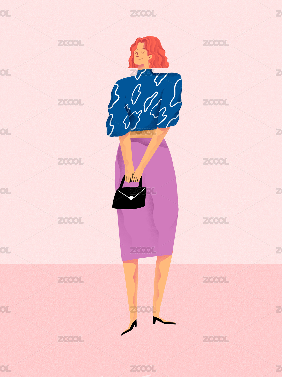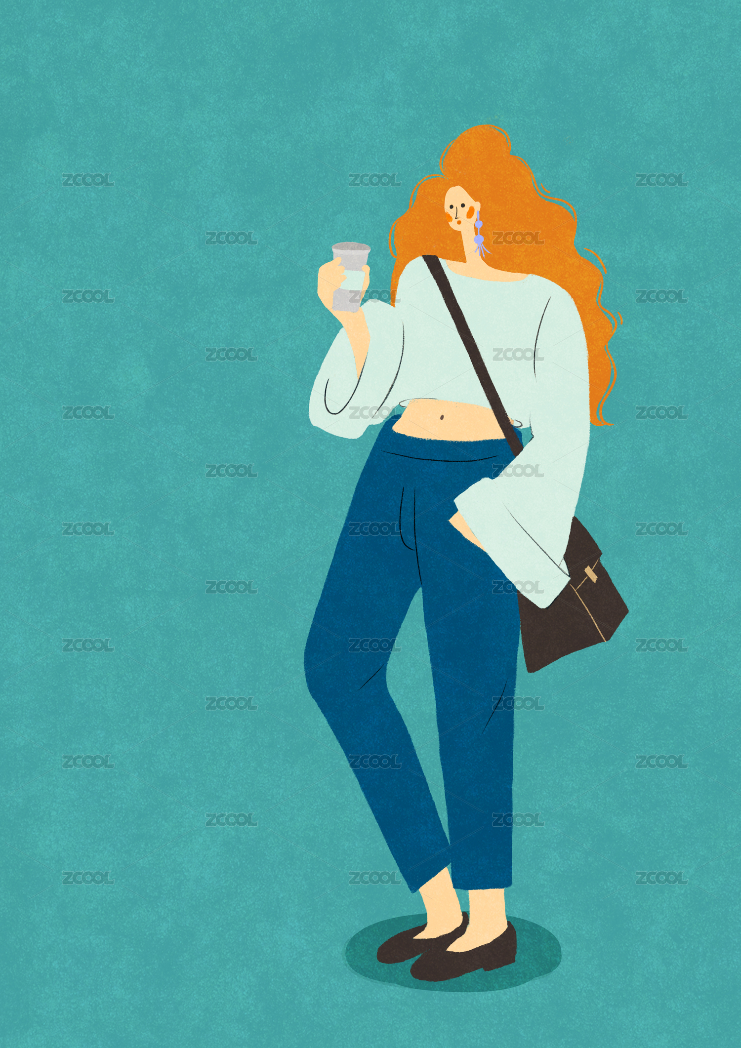 拿咖啡背斜挎包长卷发的时尚女孩插画