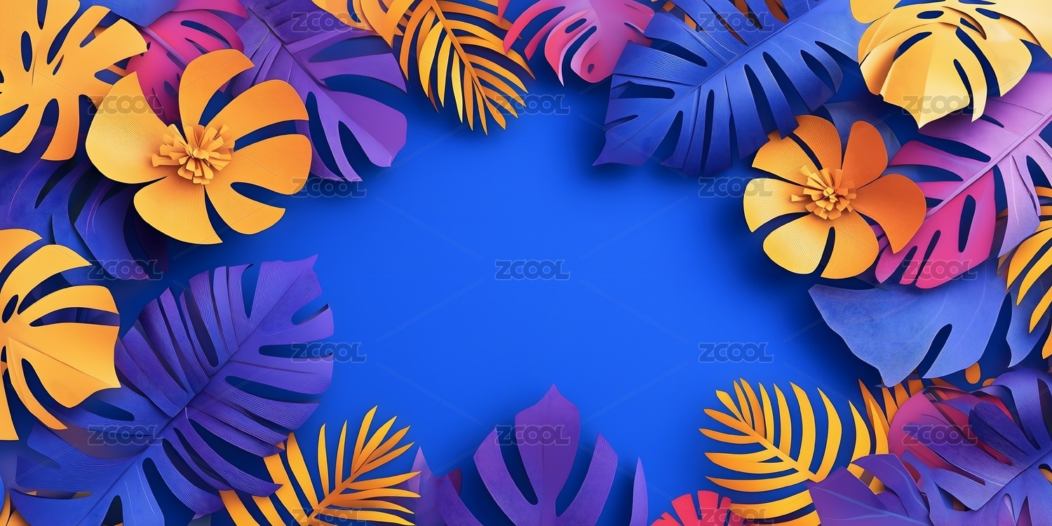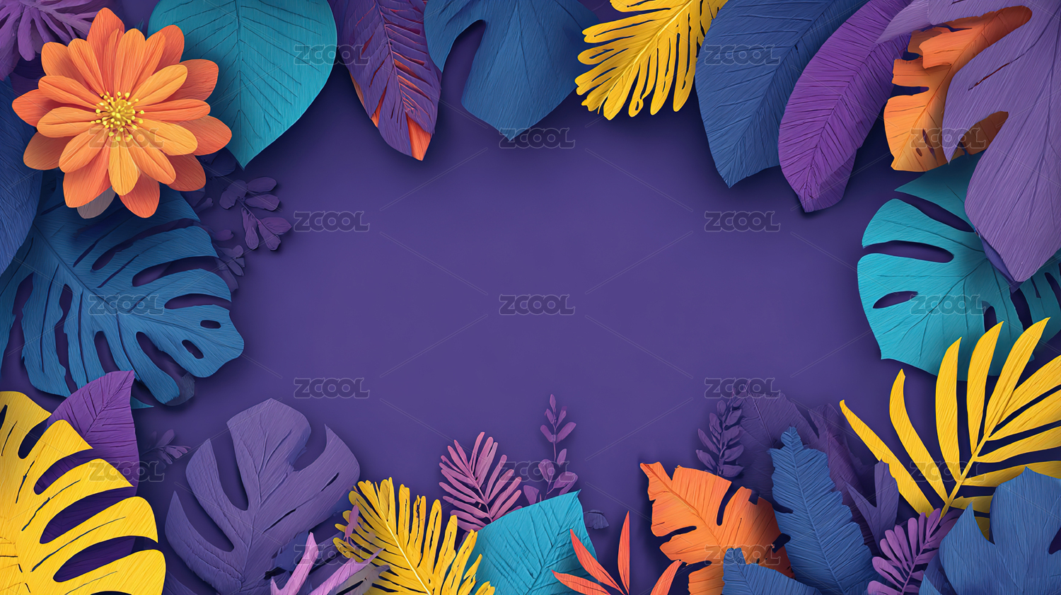 紫色背景搭配多彩热带植物叶子的边框