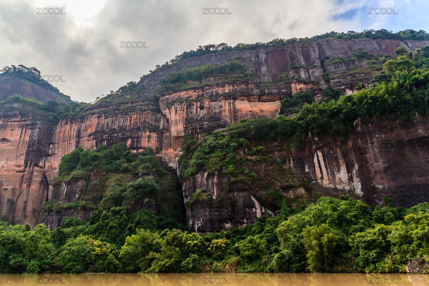中国福建省武夷山,九曲溪畔巍峨伫立的丹霞山岩