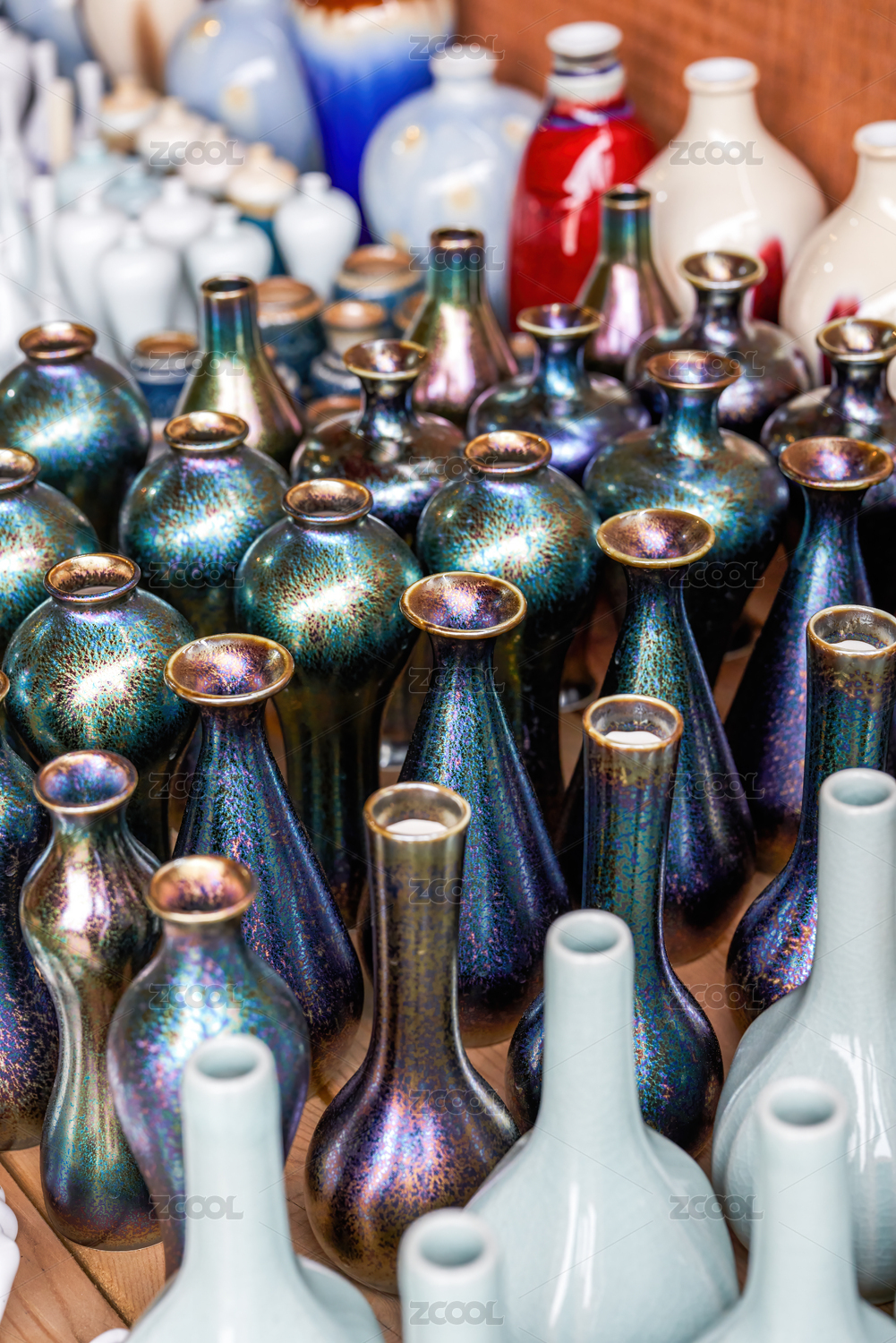 花卉市场上售卖的各种整齐的的陶瓷彩色花瓶
