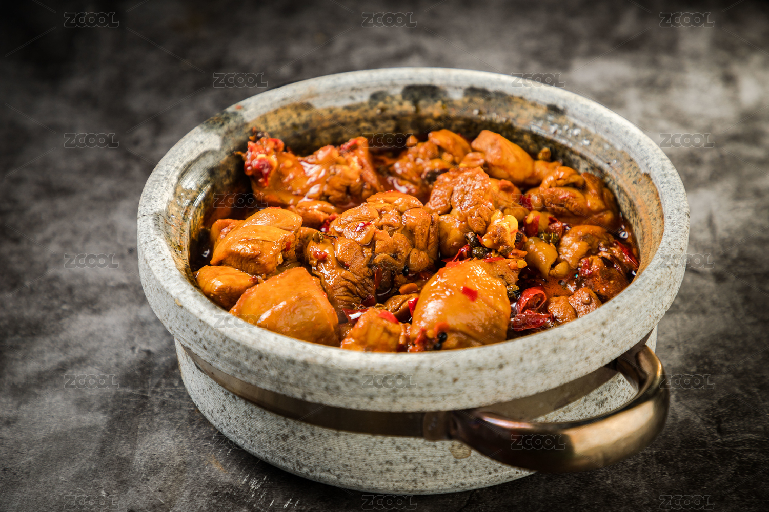 黑色砂锅装的锅烧鸡摆放在黑色鹅卵石上