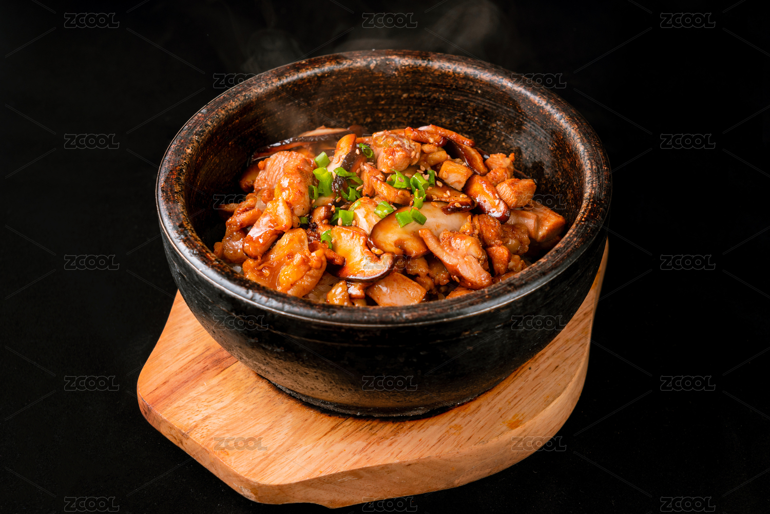 黑色砂锅装的砂锅鲍鱼鸡块摆放在樟木砧板上