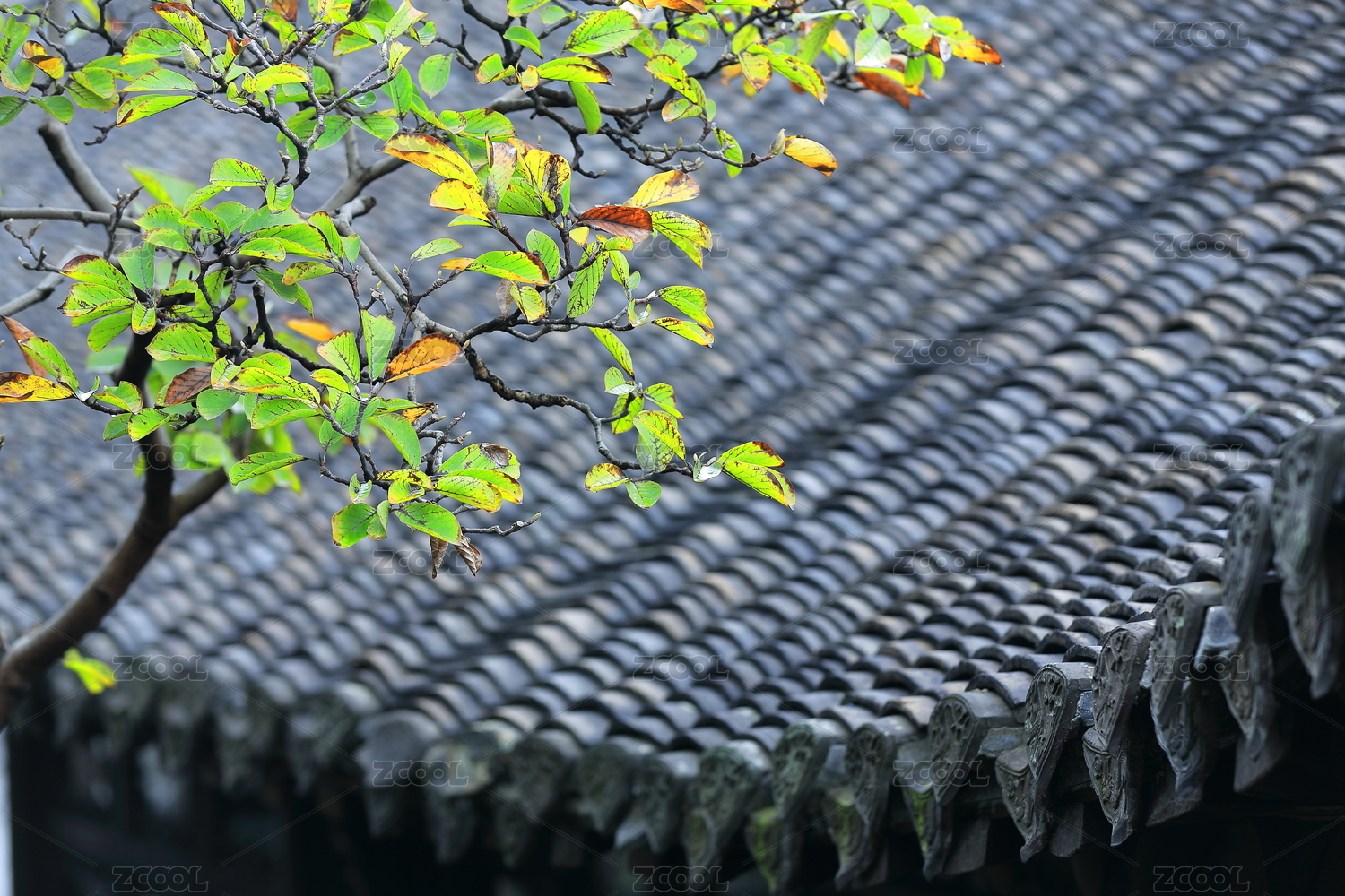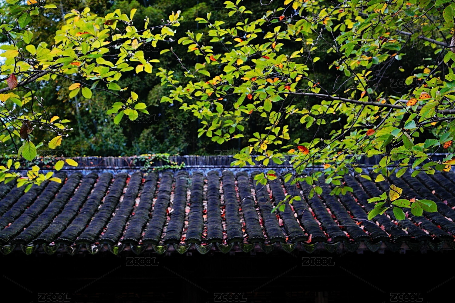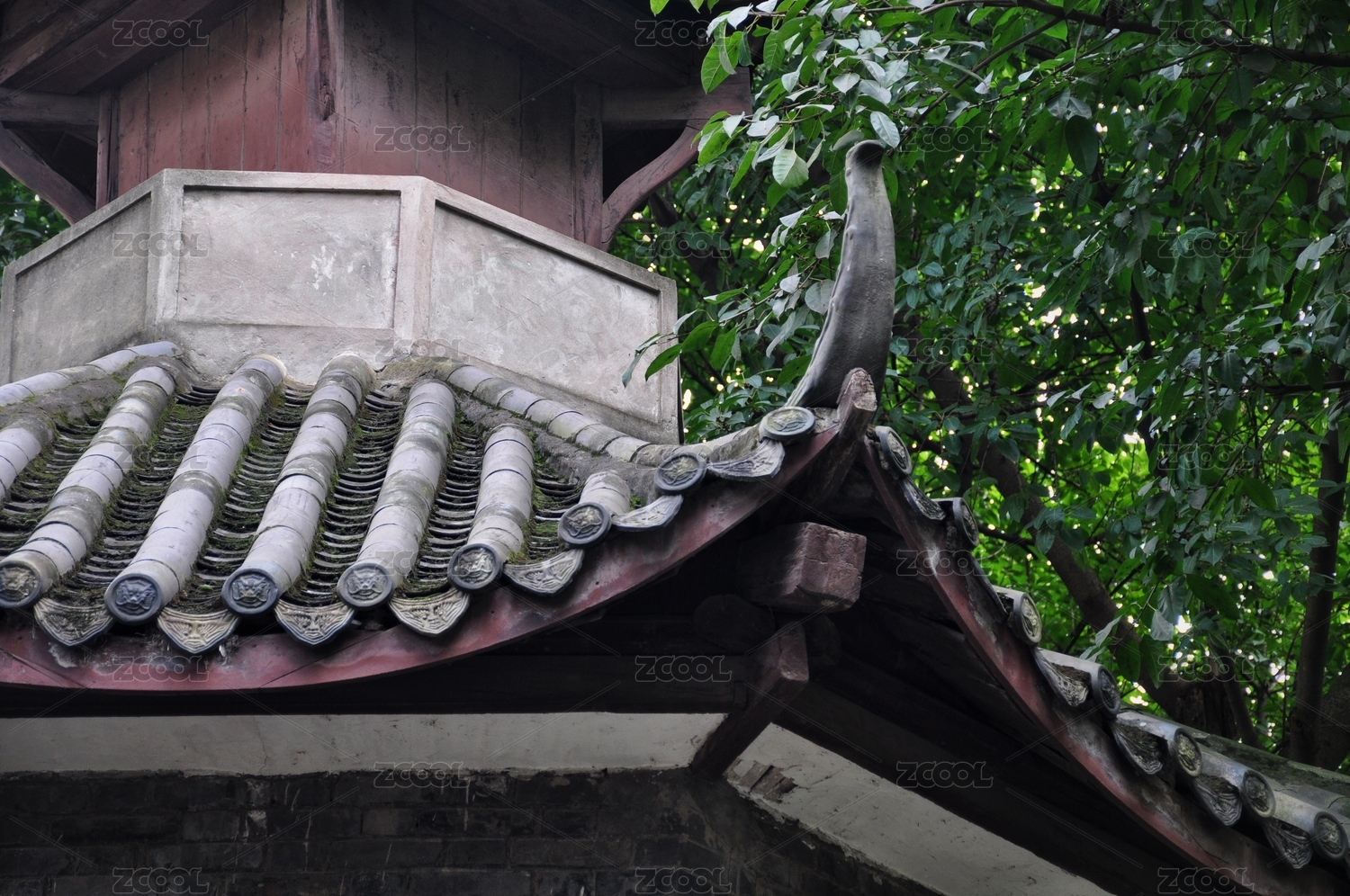 成都杜甫草堂青苔覆盖古建筑屋檐和银杏树