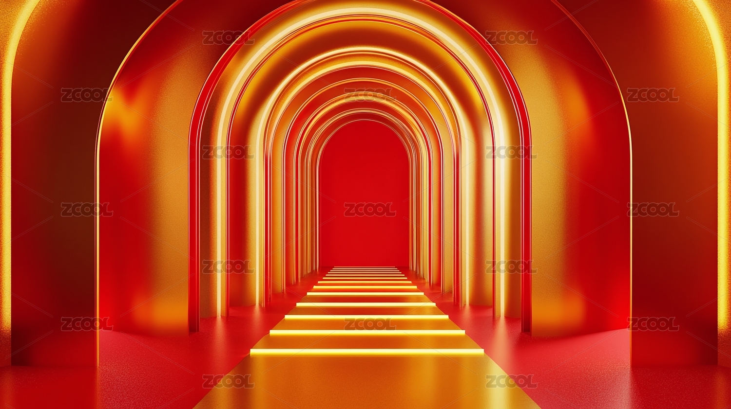 红色展台产品讲台3D背景,圆形金色霓虹灯