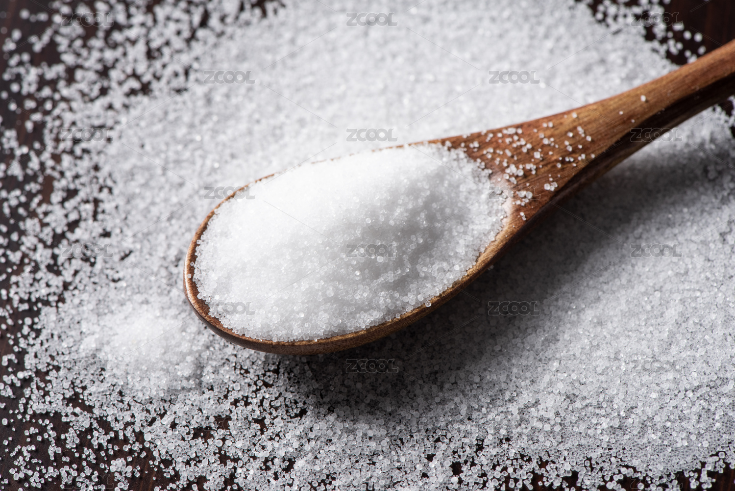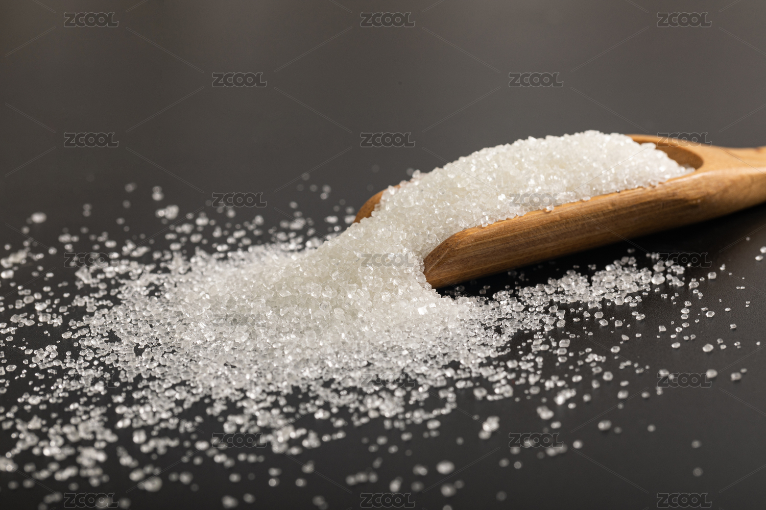 装在木勺中的白砂糖散落在木桌上