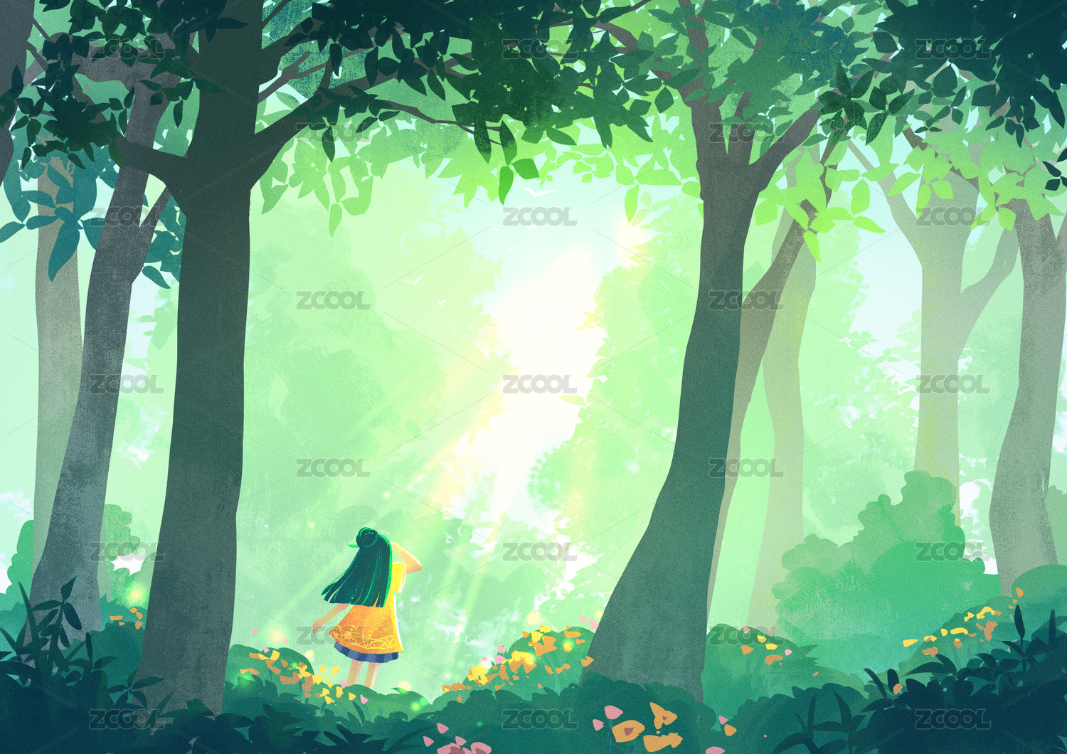 平面插画走在森林中的女孩