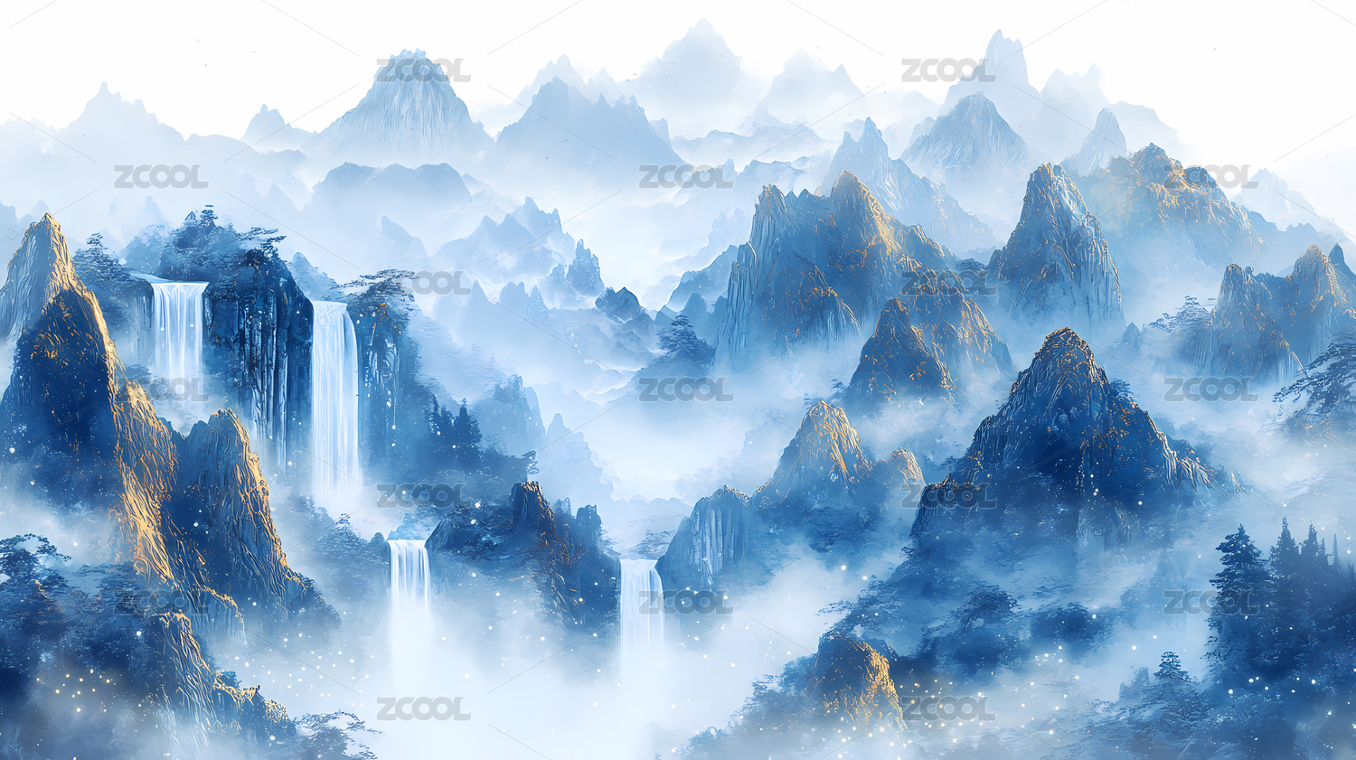 蓝色国风高山流水瀑布水墨插画海报背景