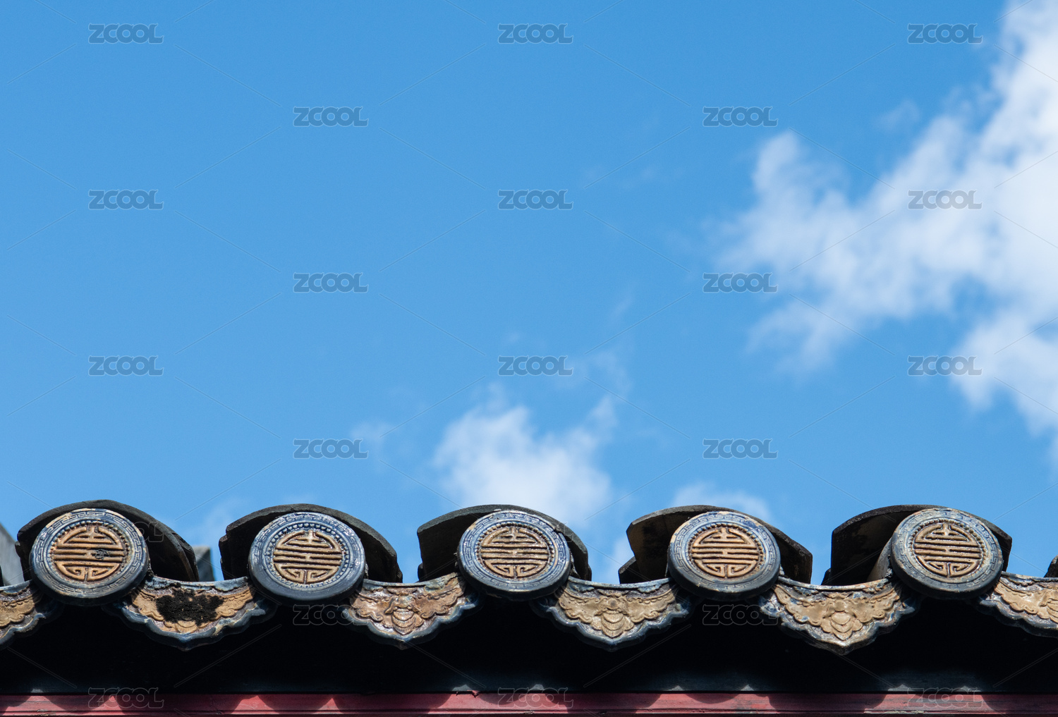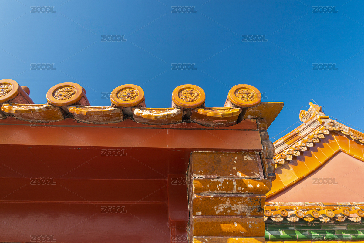 蓝天下的北京中山公园宰牲亭屋顶房檐特写