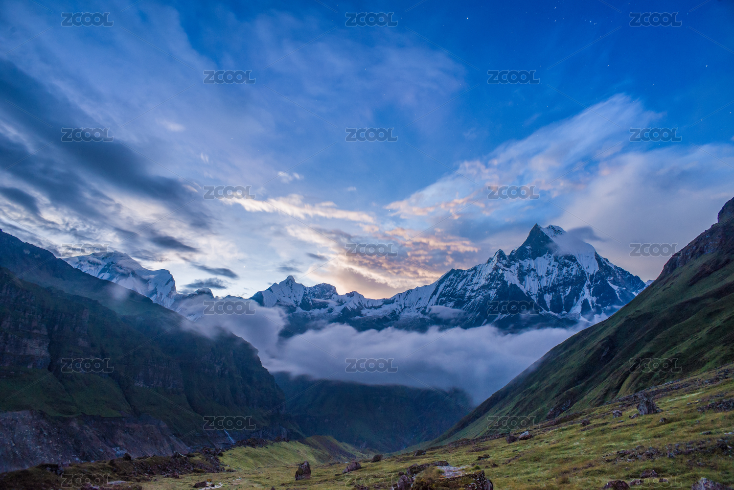 尼泊尔,博卡拉,安纳普尔纳,雪山,草甸,天空,清晨,云,雾,岩石