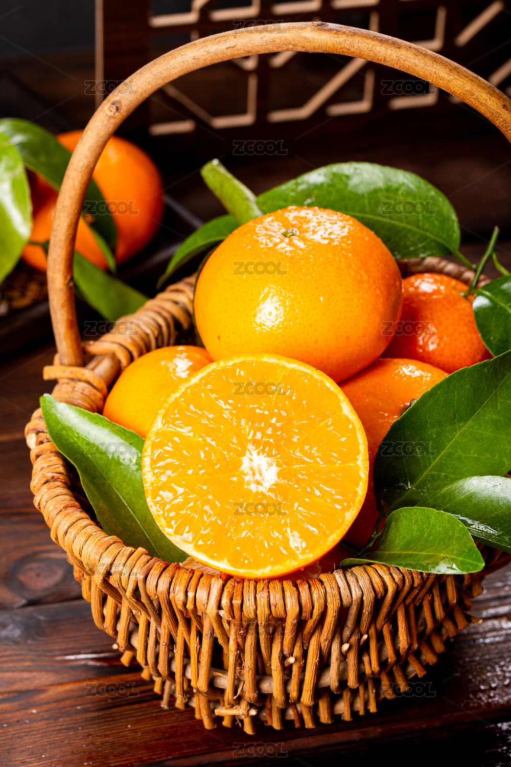 放在木桌竹筐里的多个新鲜四川凉山雷波脐橙