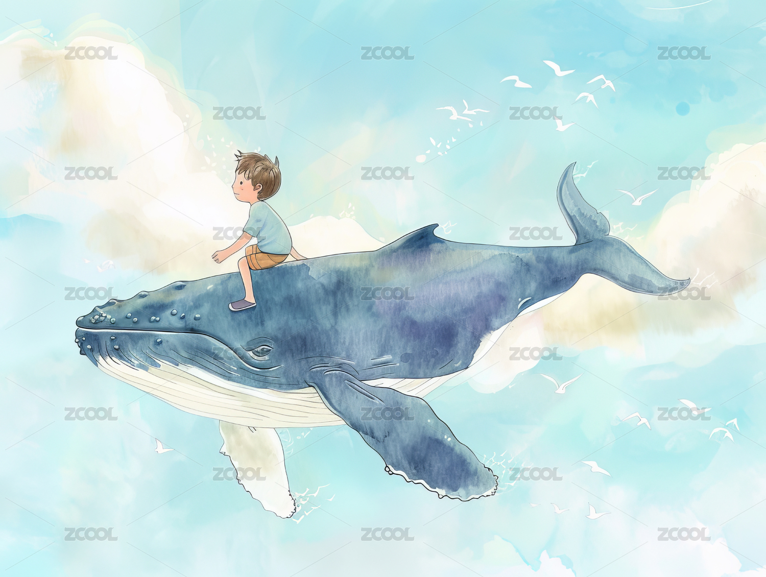 女孩骑在大鱼身上,搭配海洋和七彩天空背景