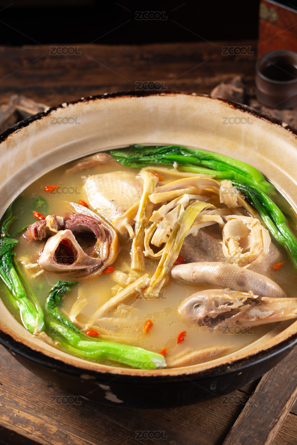 木桌面上黑色汤锅上装着一锅乌鸡汤特写