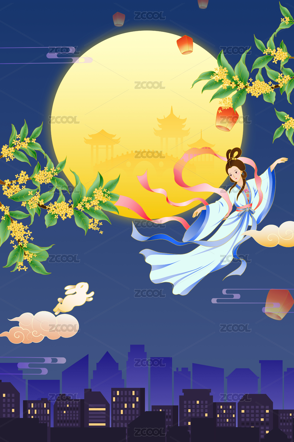 中秋佳节城市上空桂花树下嫦娥奔月插画