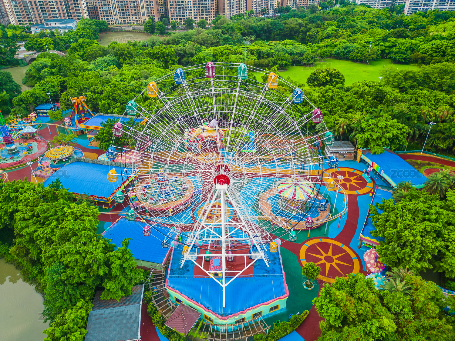 航拍春季蓝天下的广西柳州市游乐城和摩天轮全景