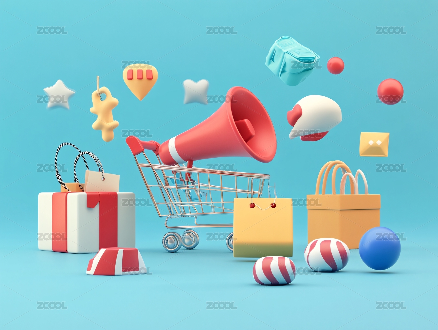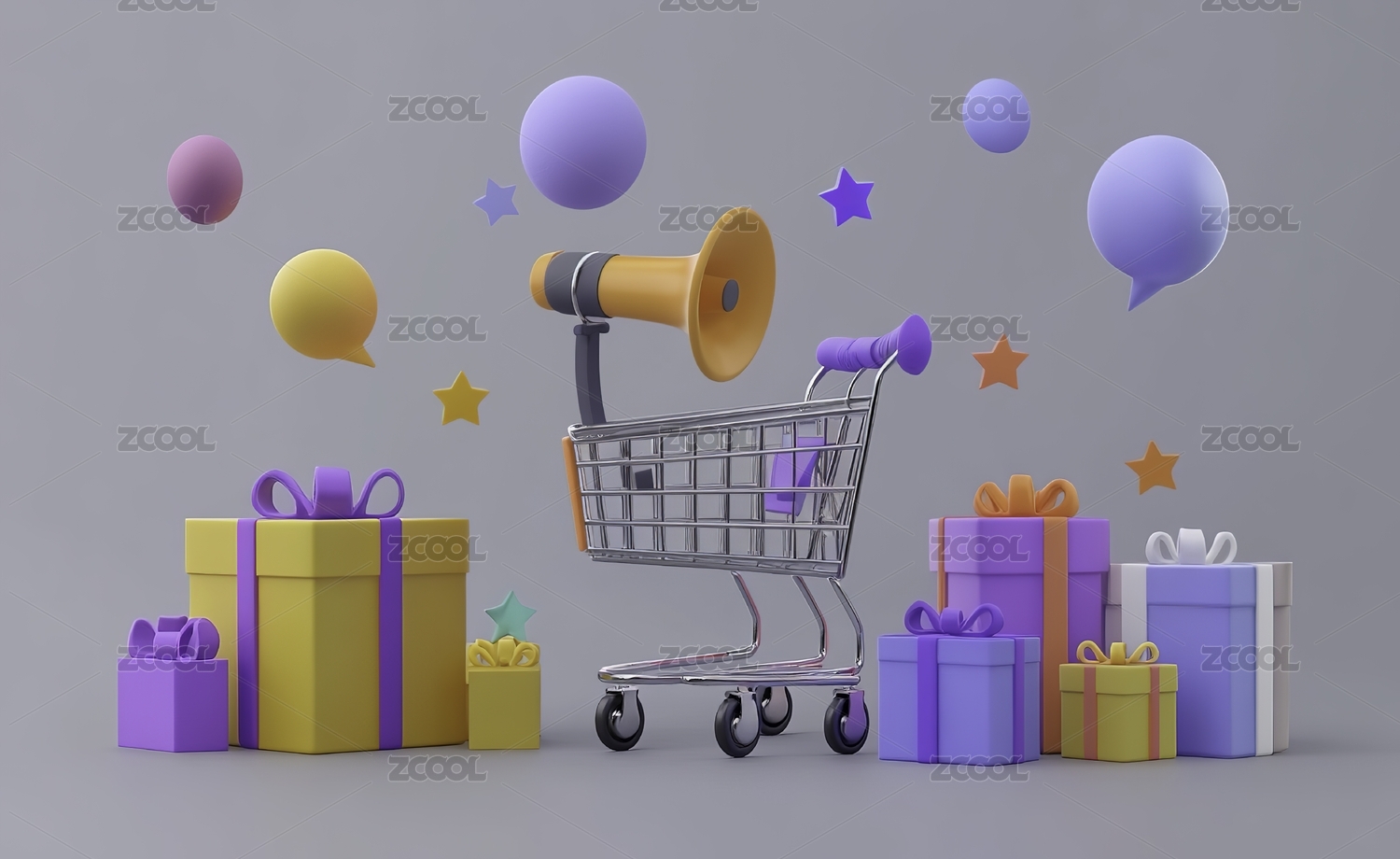 蓝色背景,购物车、麦克风和礼物的3D插图