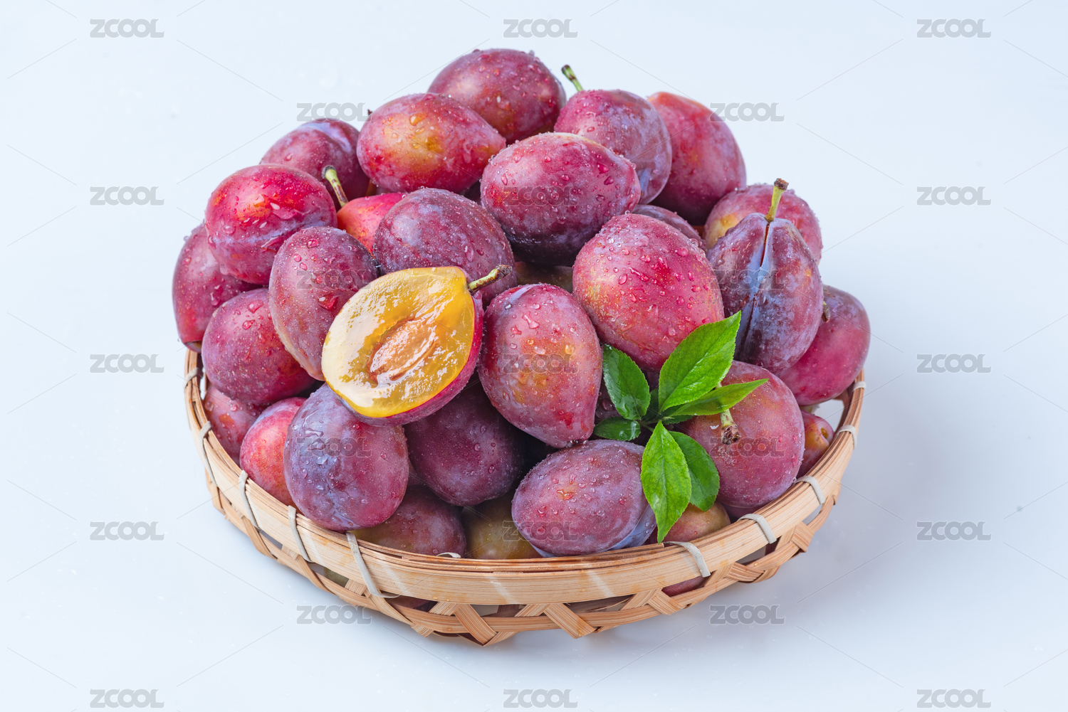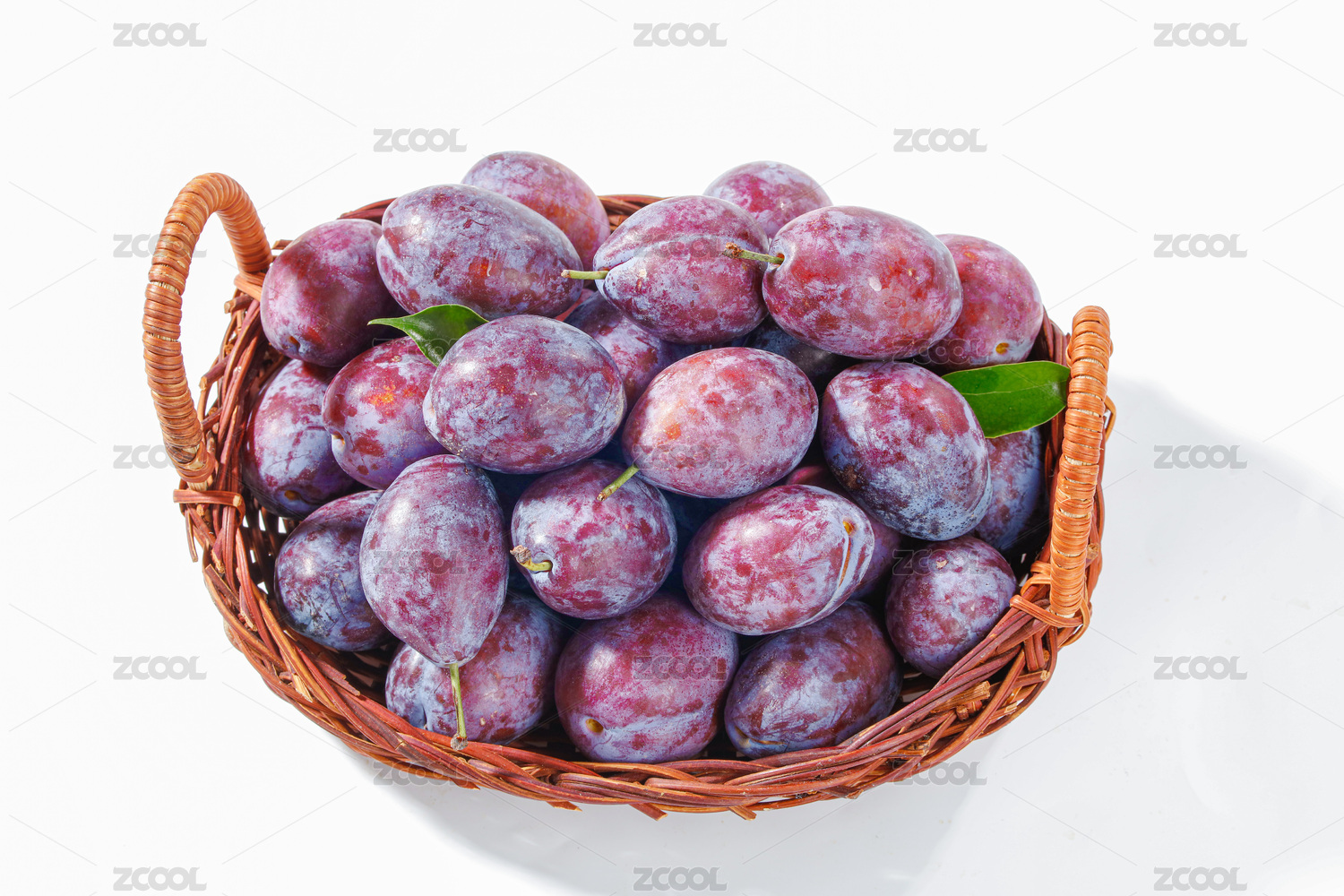 白色背景上装在篮子里的西梅