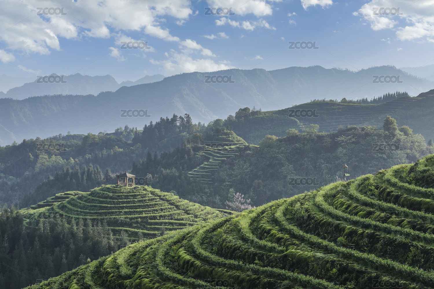 大觉山,茶园,绿色,天空,云,春季,植物,地形,雾,早晨