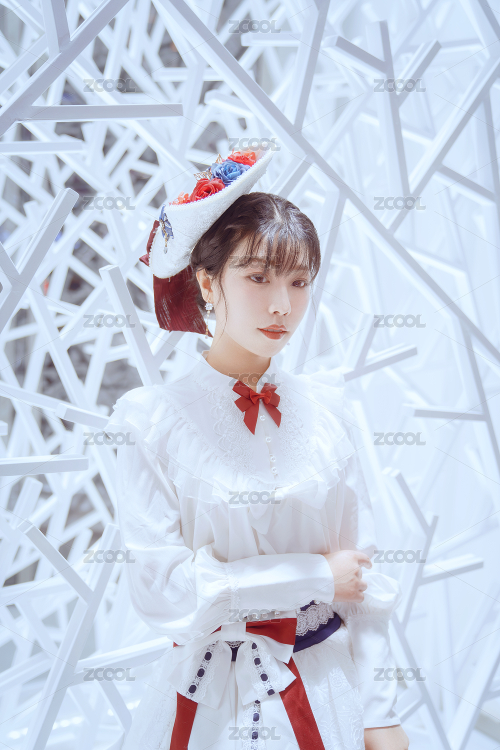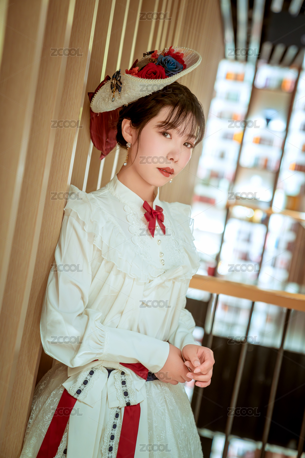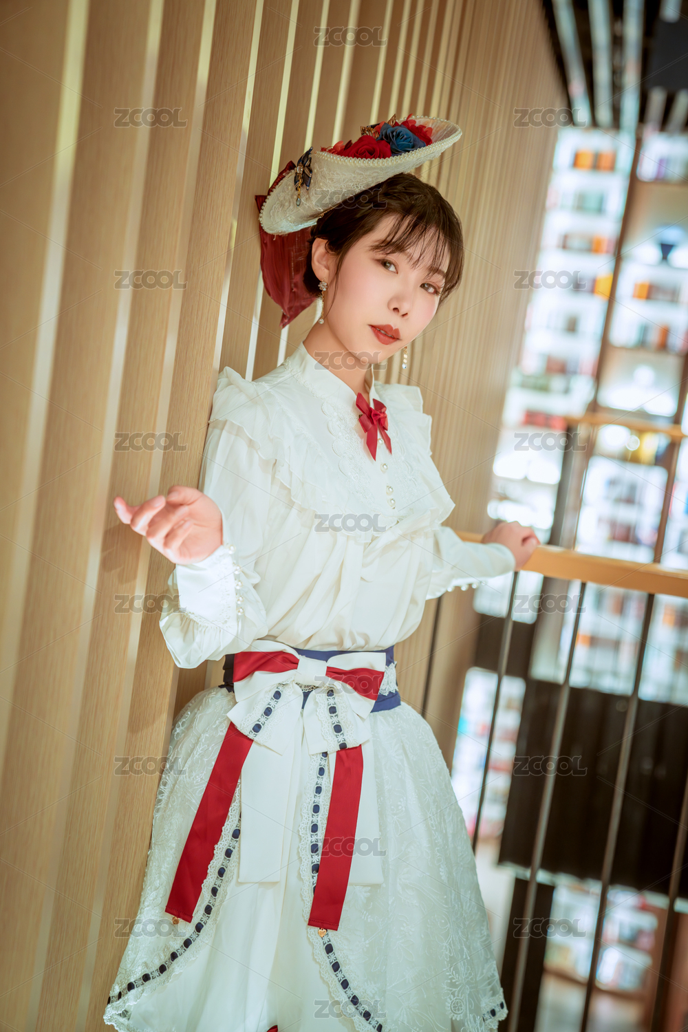 图书馆中穿着白色连衣裙的优雅可爱女子