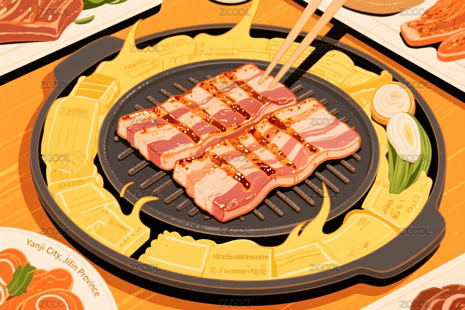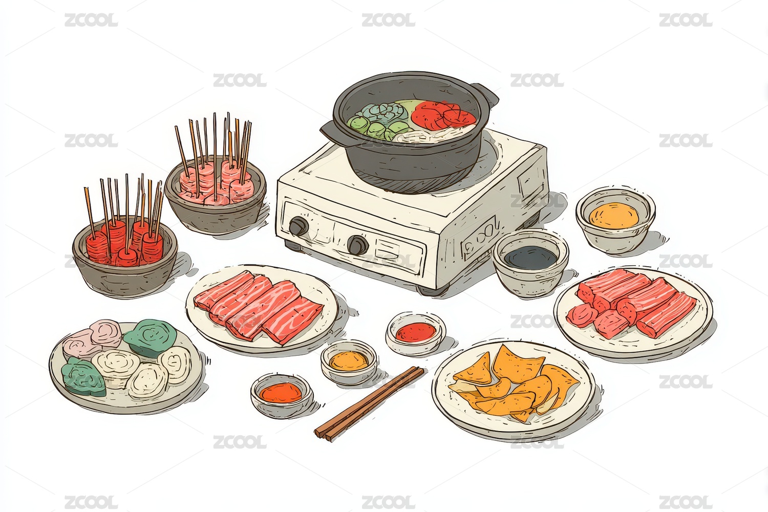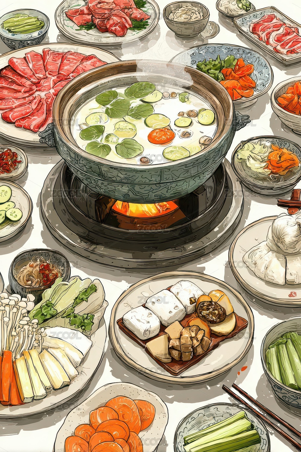 热气腾腾的美味自助火锅 牛肉蔬菜菌菇蛋糕卡通动漫风的矢量插画