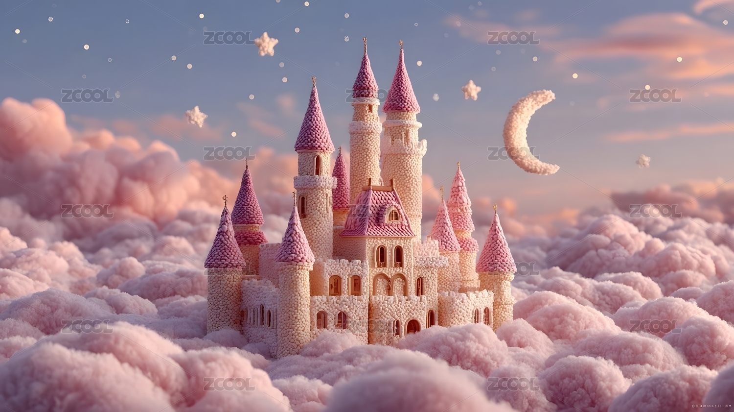 城堡,云彩,天空,山,幻想,童话故事,粉红色,蓝色,绿色,瀑布
