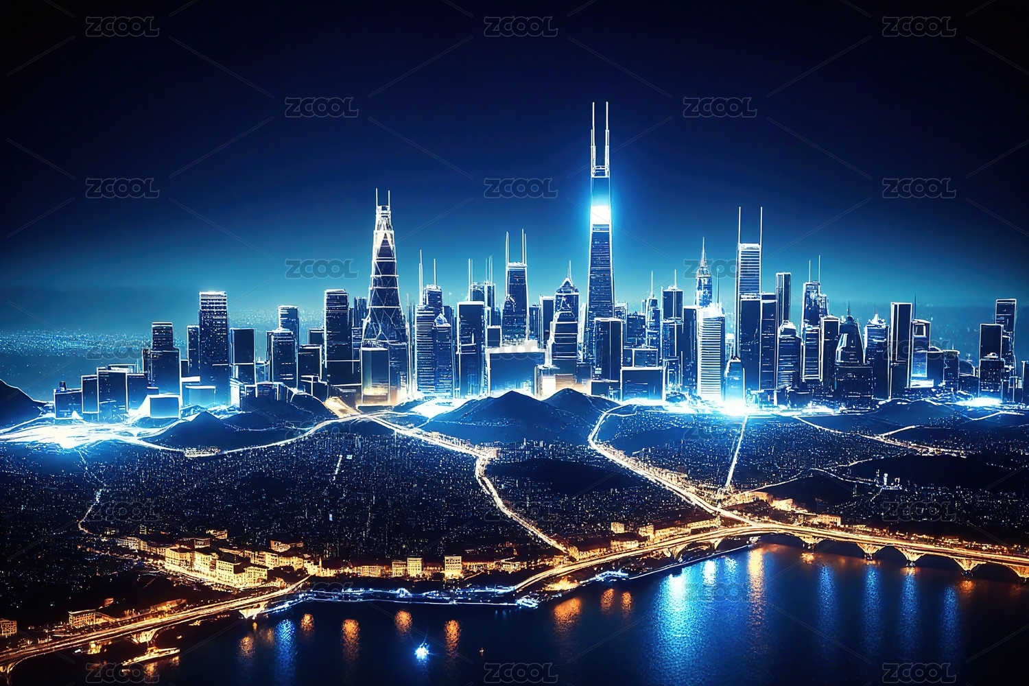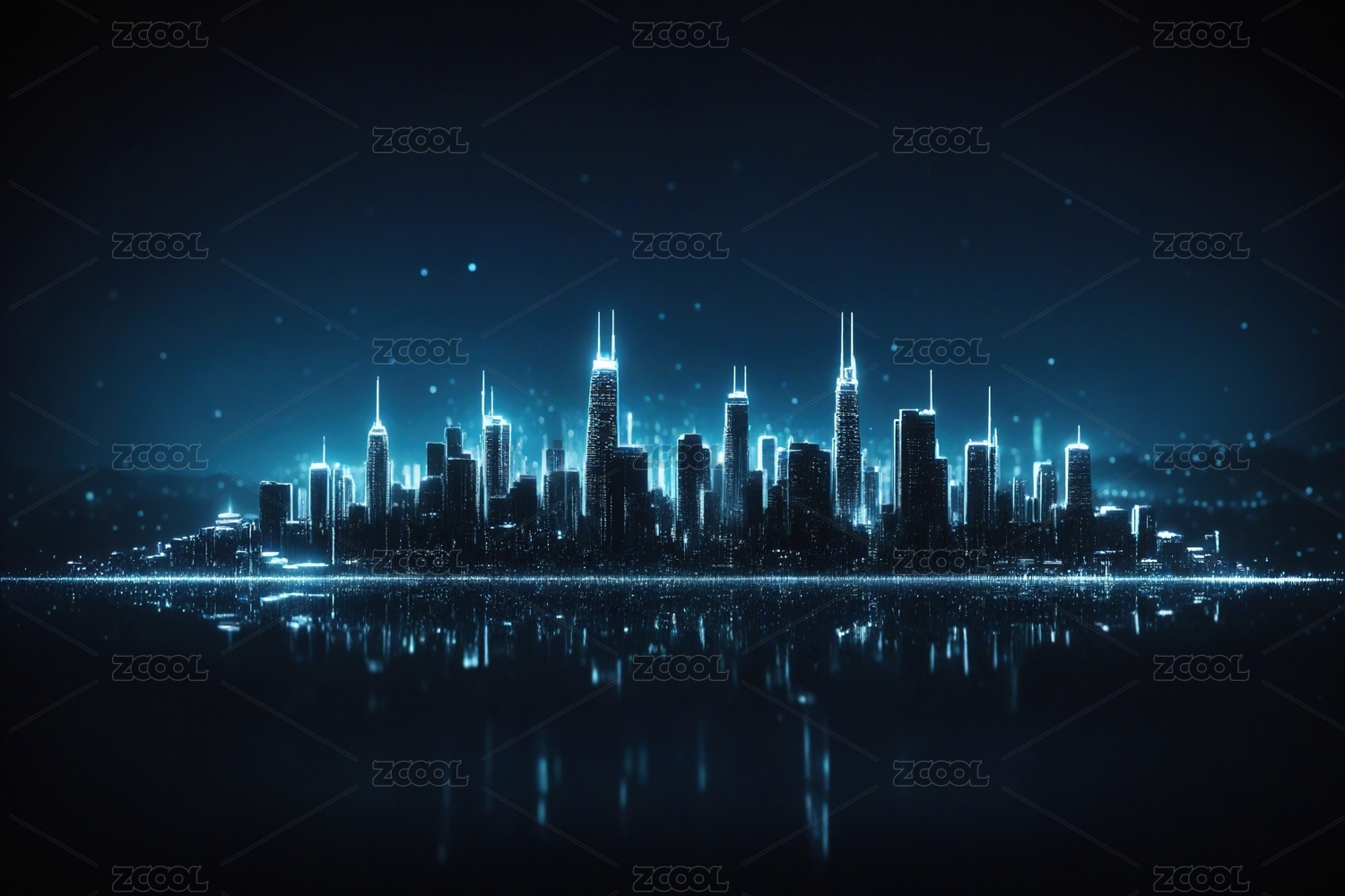 夜,城市,天际线,摩天大楼,灯光,反射,水面,建筑,都市,繁华