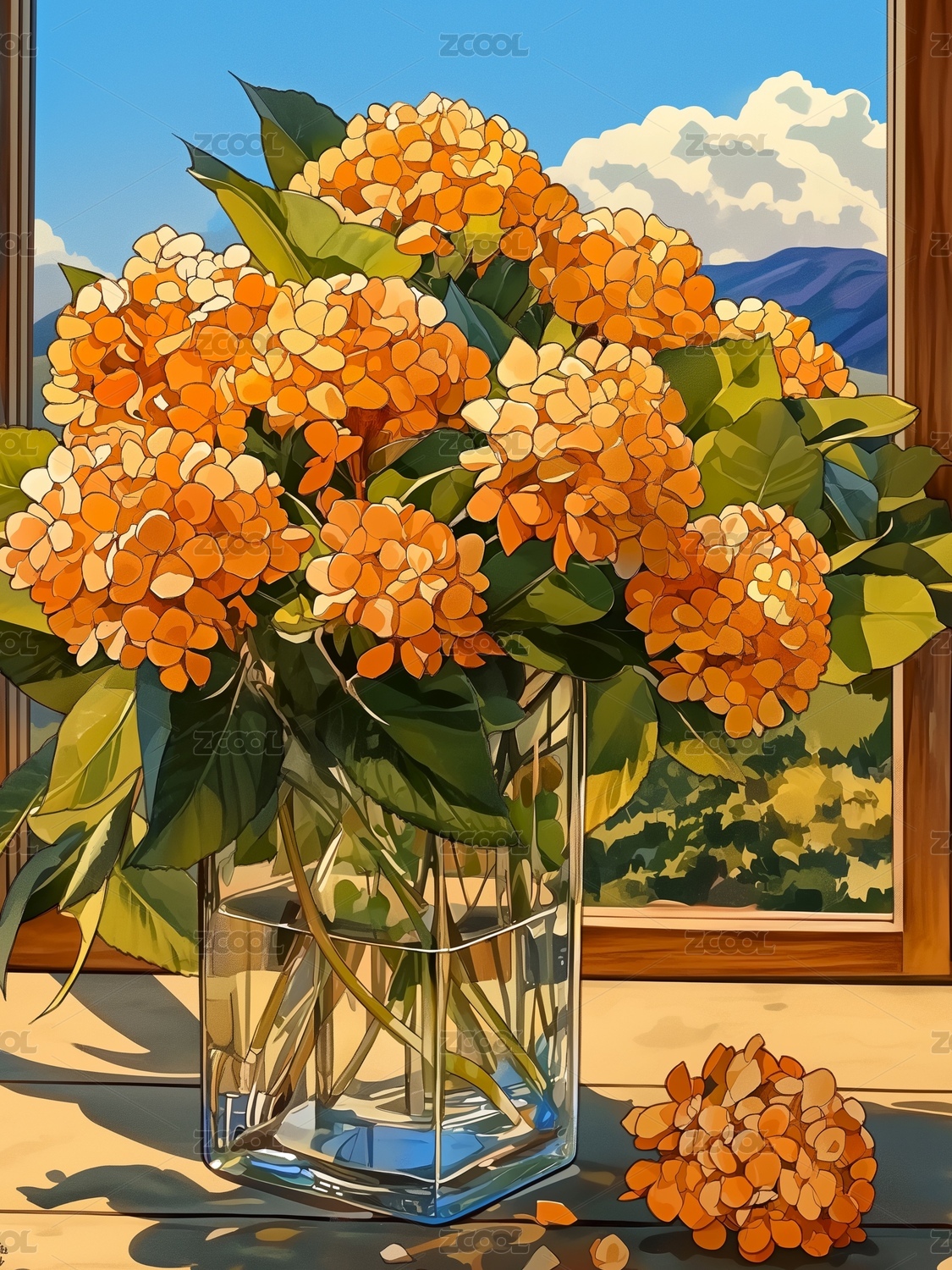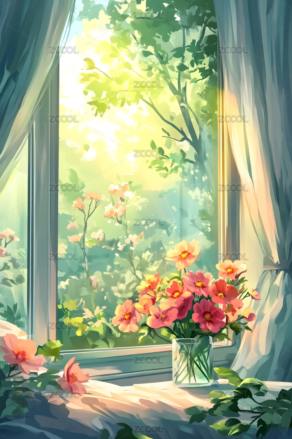海边窗台花卉风景插画