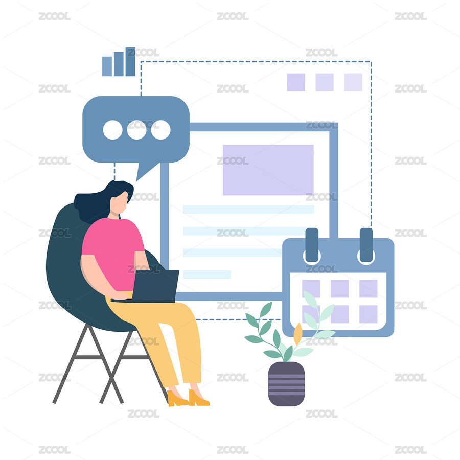 在客厅里上网完成工作的女士,扁平矢量人物场景创意概念插画