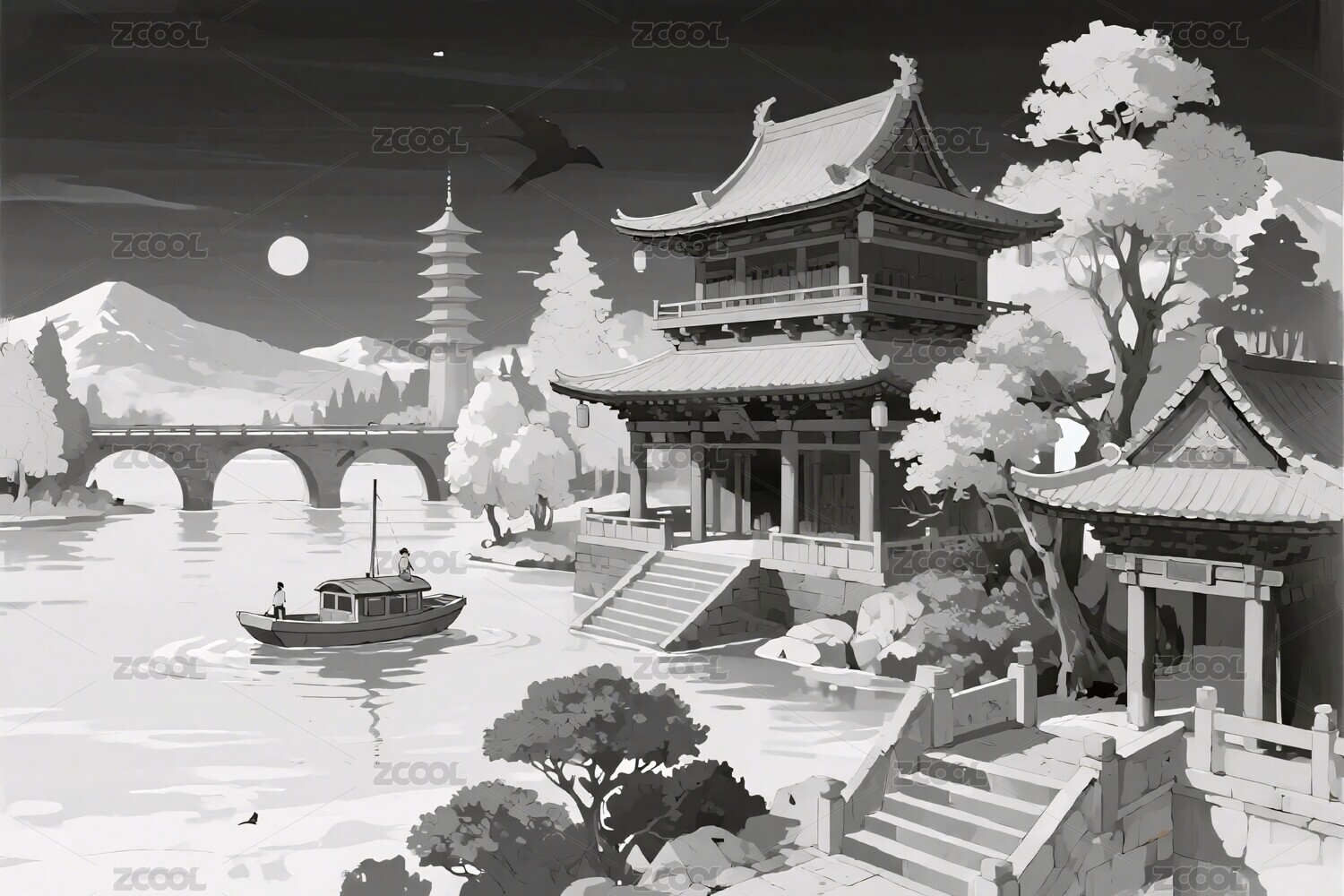 手绘中国风古建筑水墨游戏原画