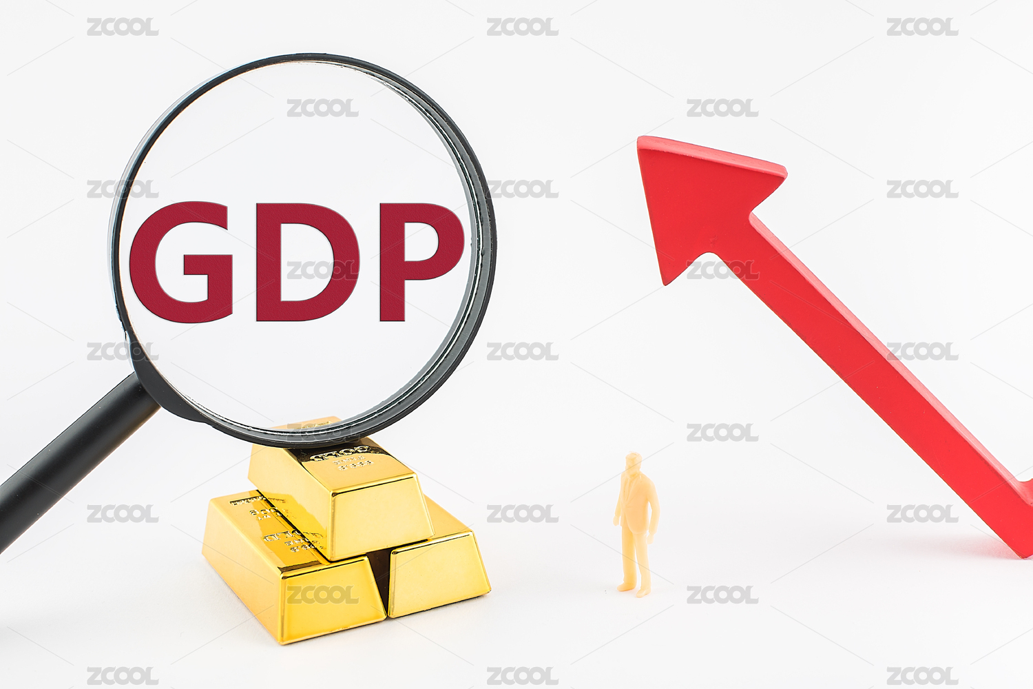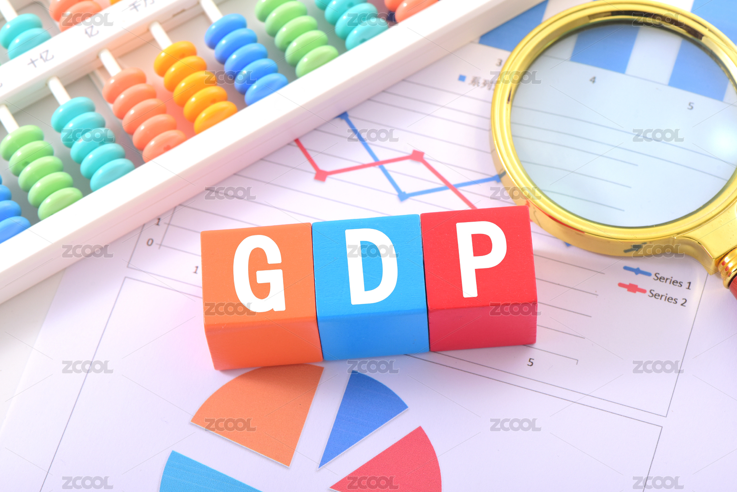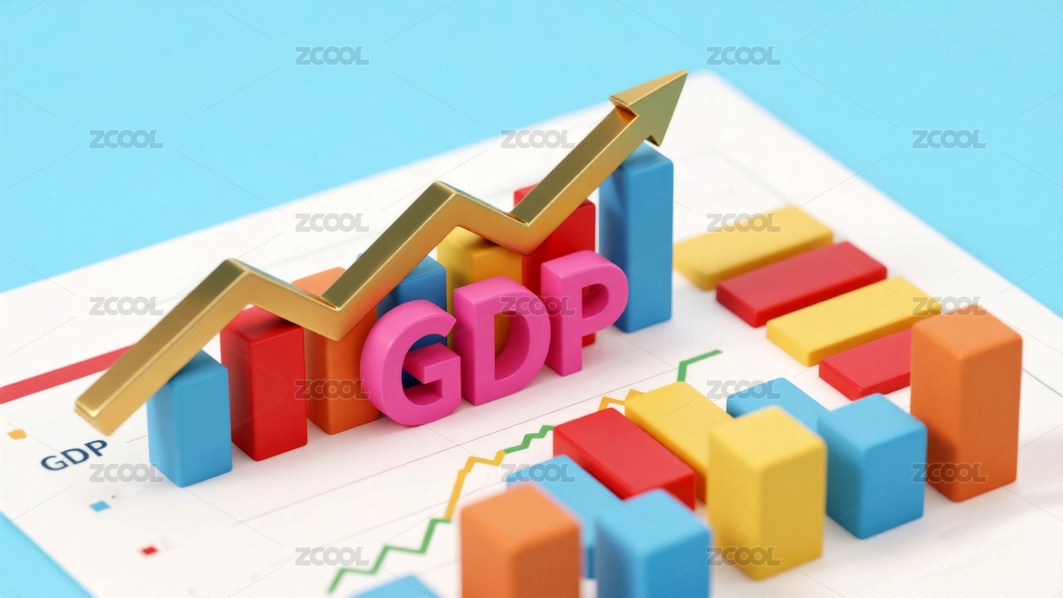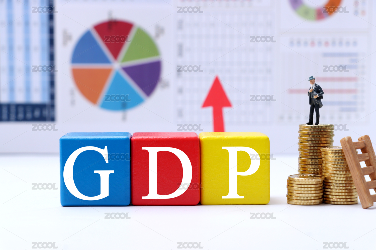 桌面摆着三个印着GDP的方块和上涨的箭头