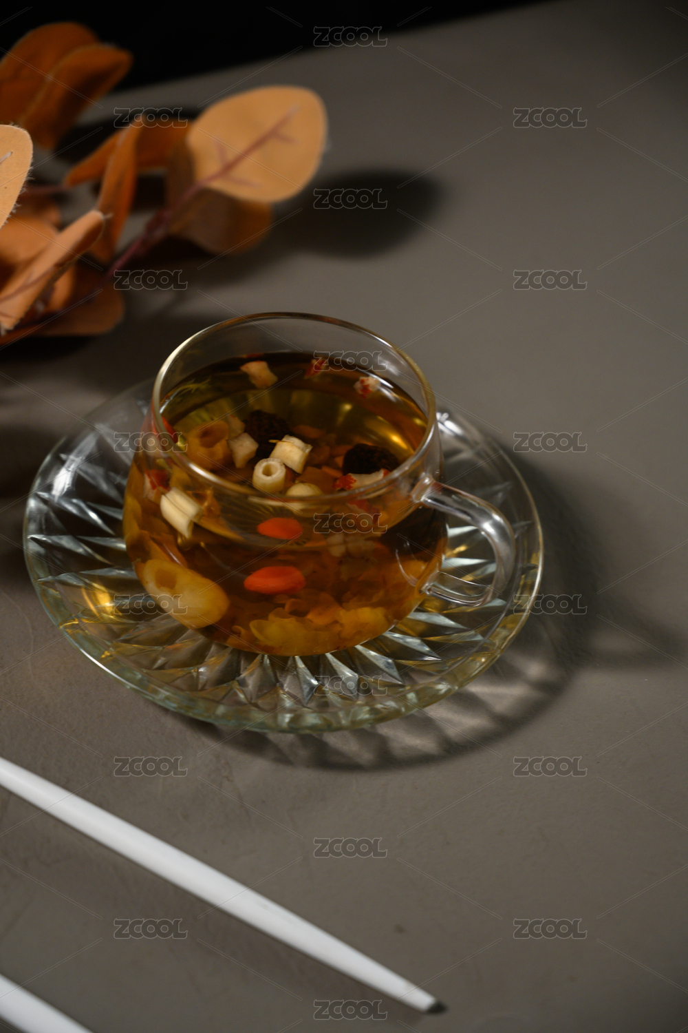 桌面上的杯子里的的甘甜可口的西洋参茶