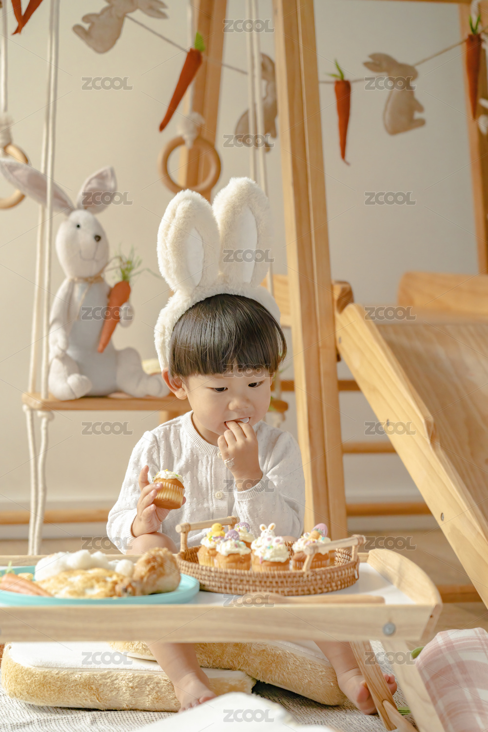 兔子头饰男孩享受复活节饭团冰淇淋蛋糕美