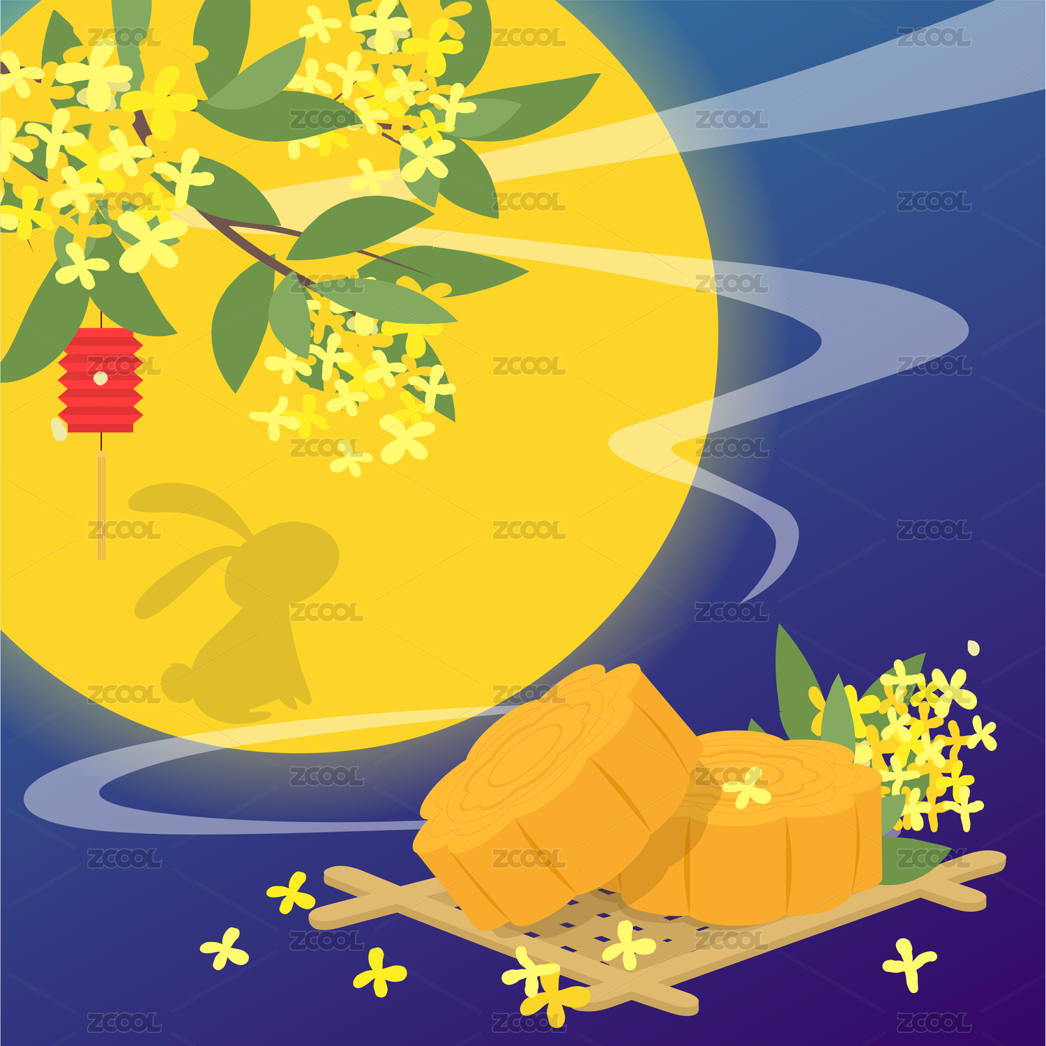 中秋月圆月兔和月饼插画