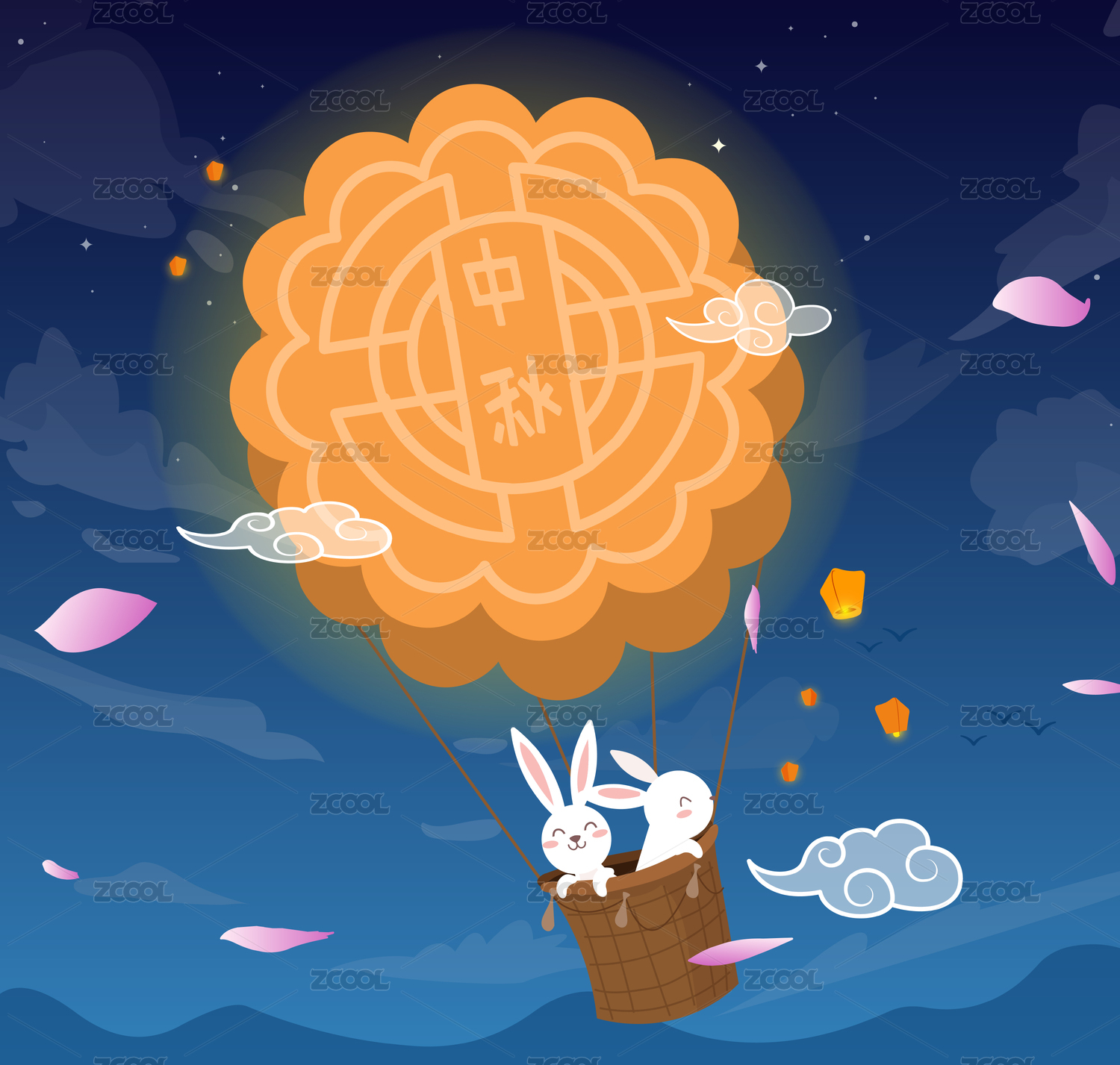 中秋节夜空中月饼气球和兔子的矢量插画