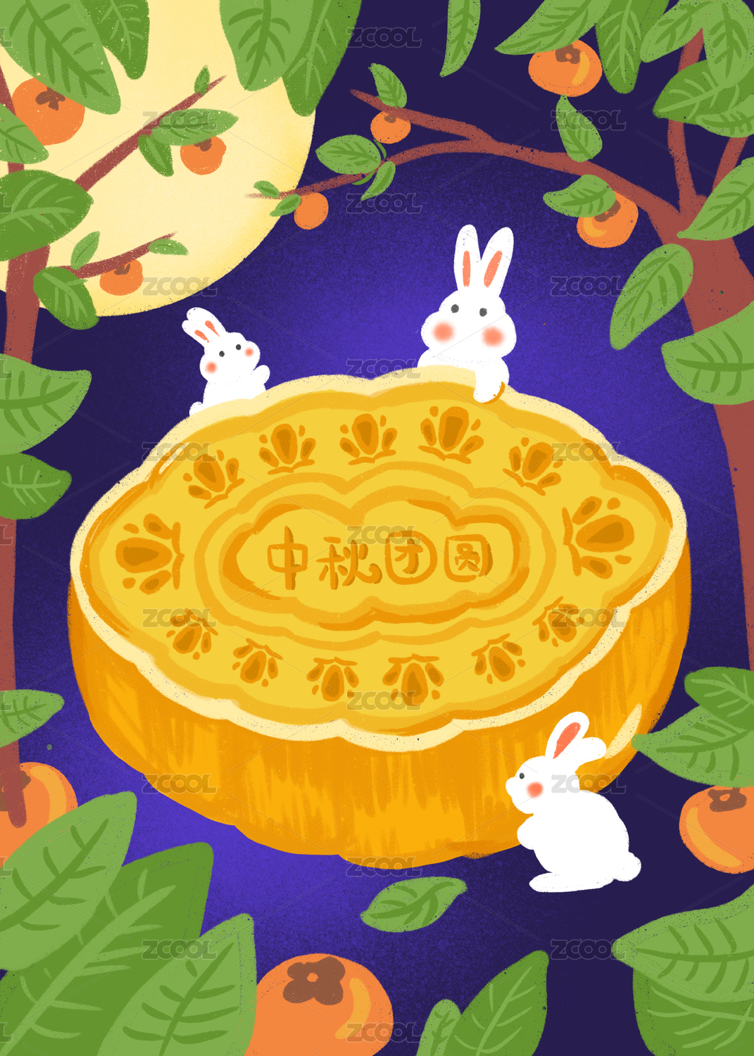 中秋节全家团圆玉兔月饼柿子插画图
