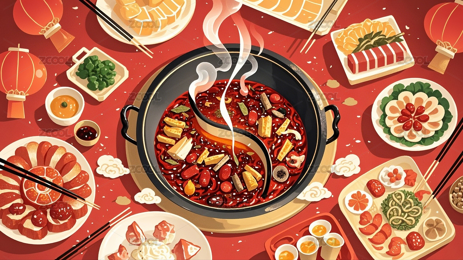 红色背景下的丰盛火锅宴