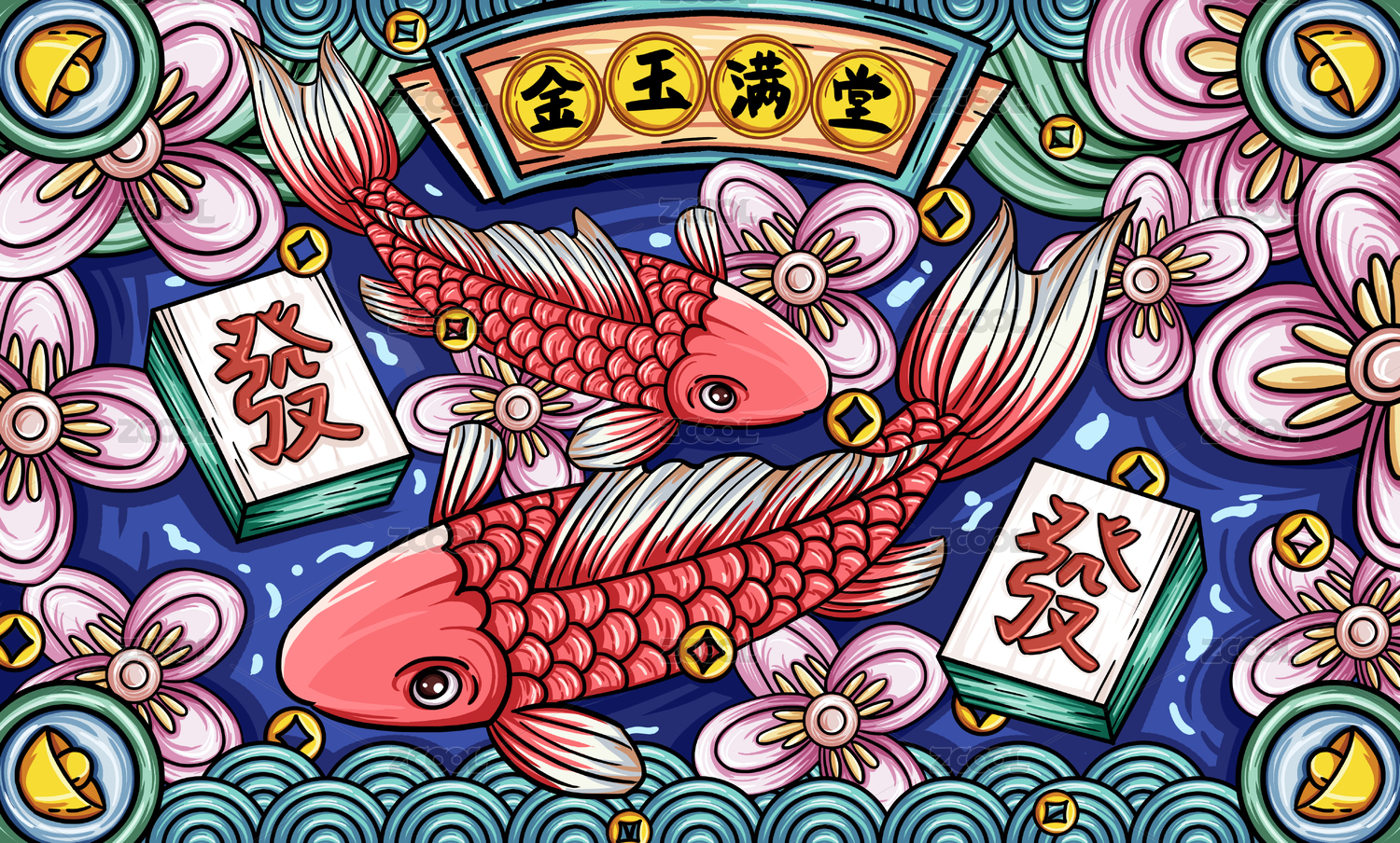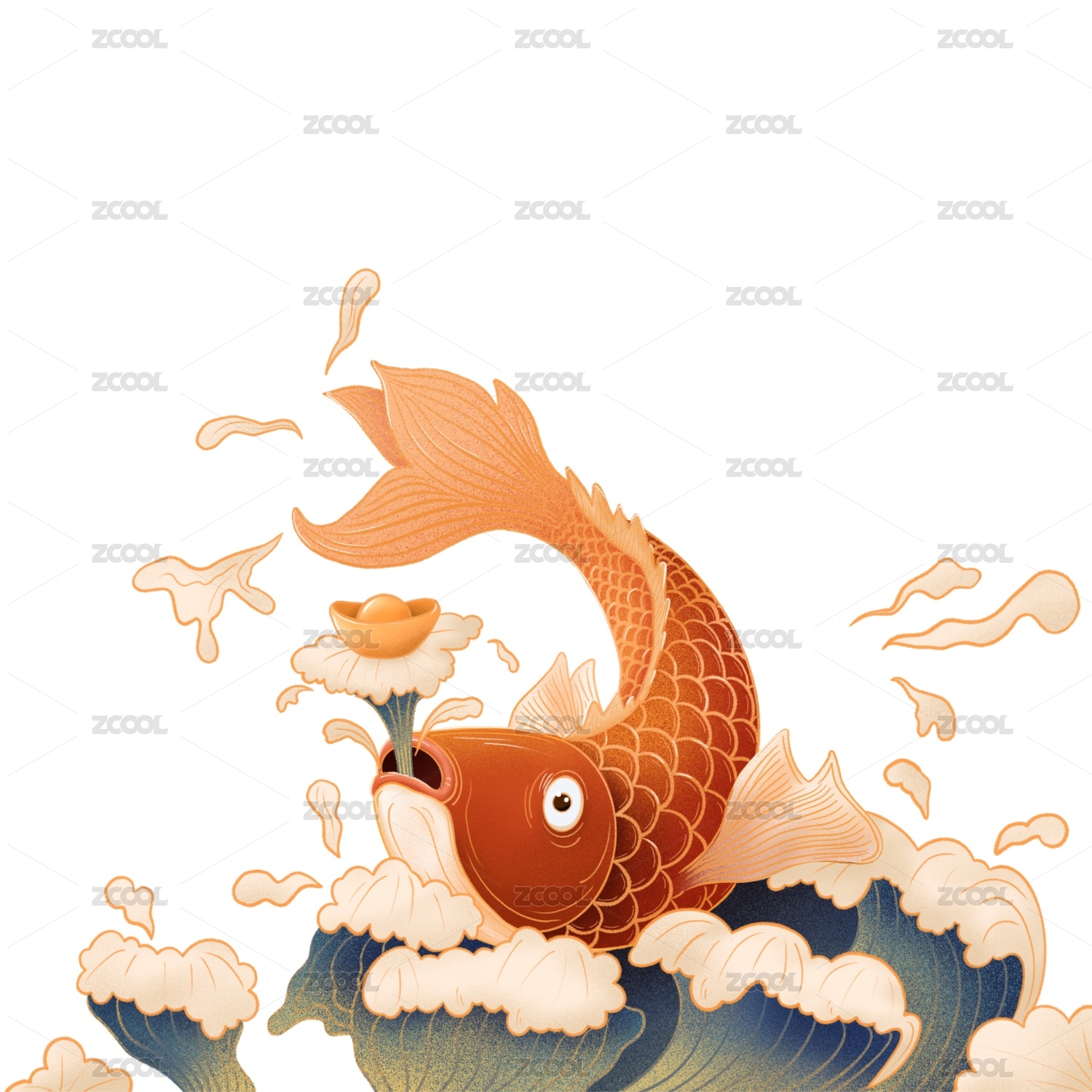 浪花上的锦鲤嘴上喷出元宝节日插画