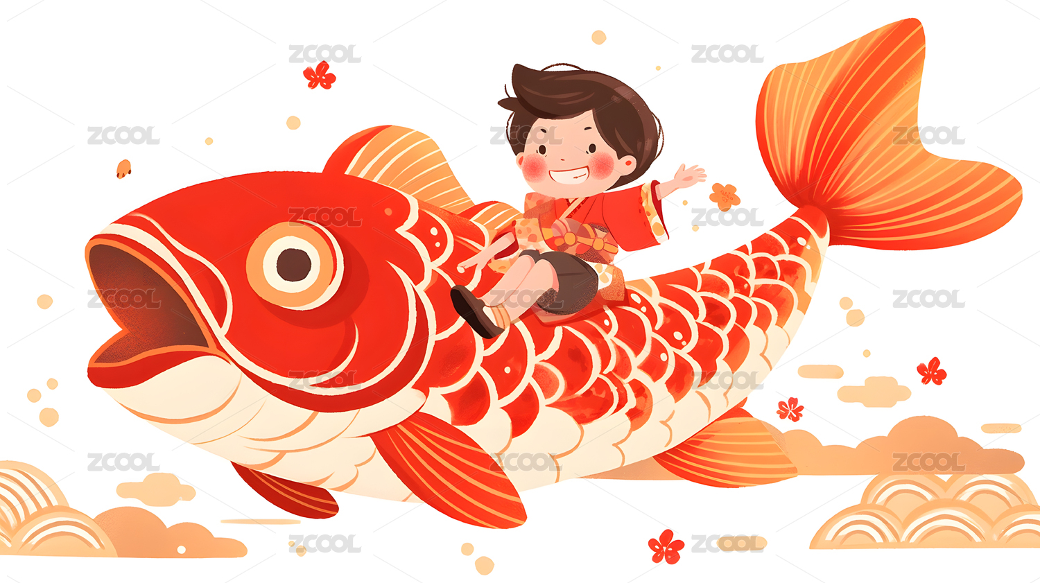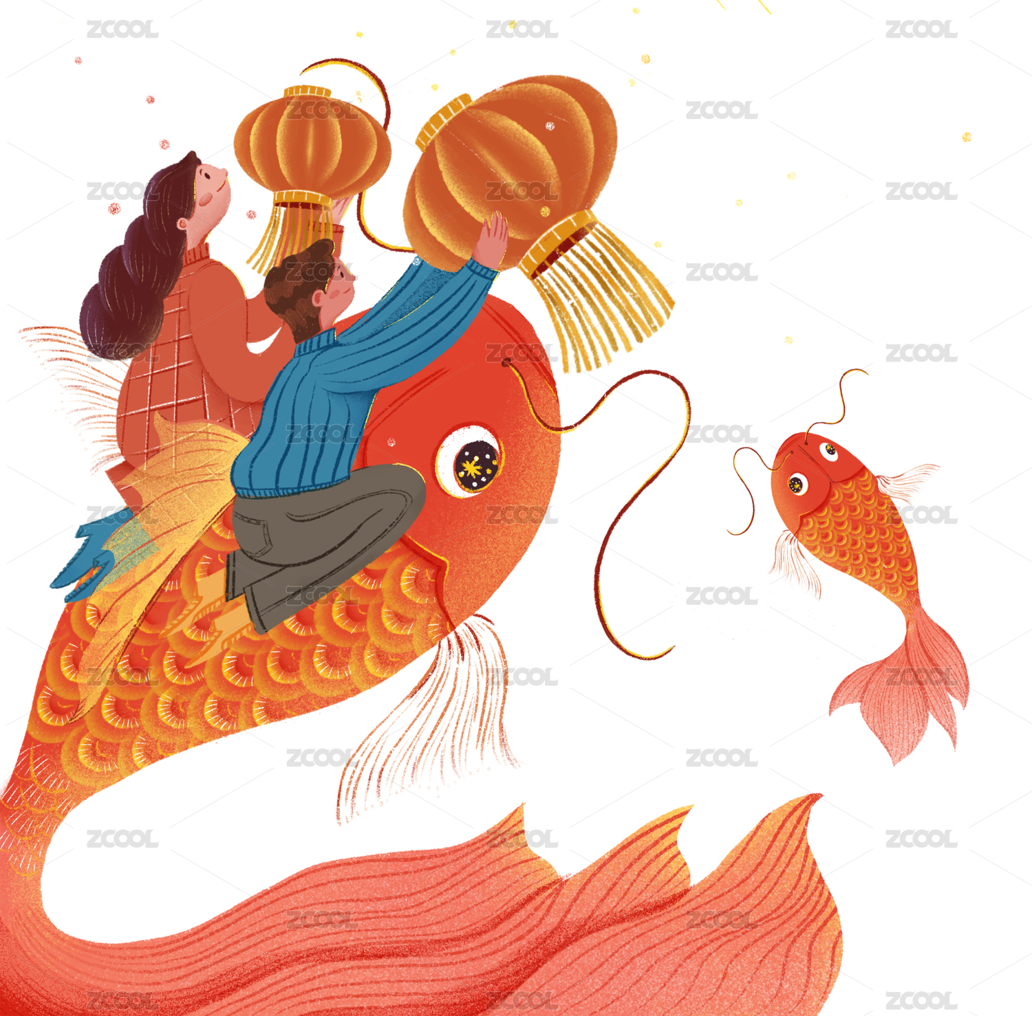 喜气洋洋的骑着跳跃的鲤鱼挂灯笼