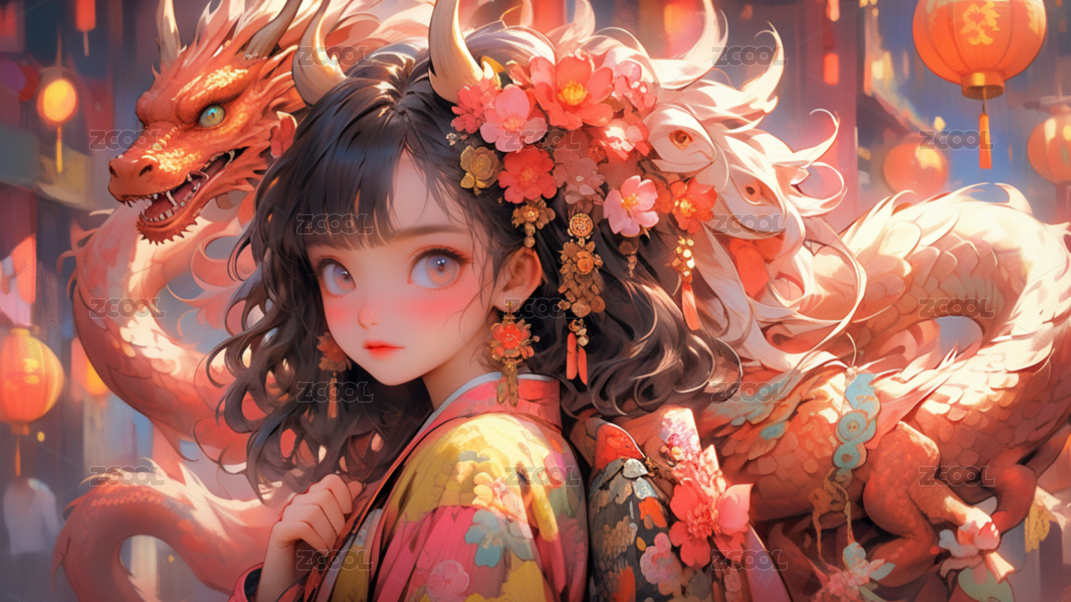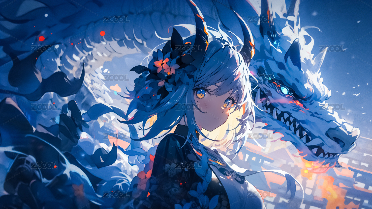 龙,女性,人像,二次元,女孩,围栏,墙壁,壮观,花瓣,中国龙